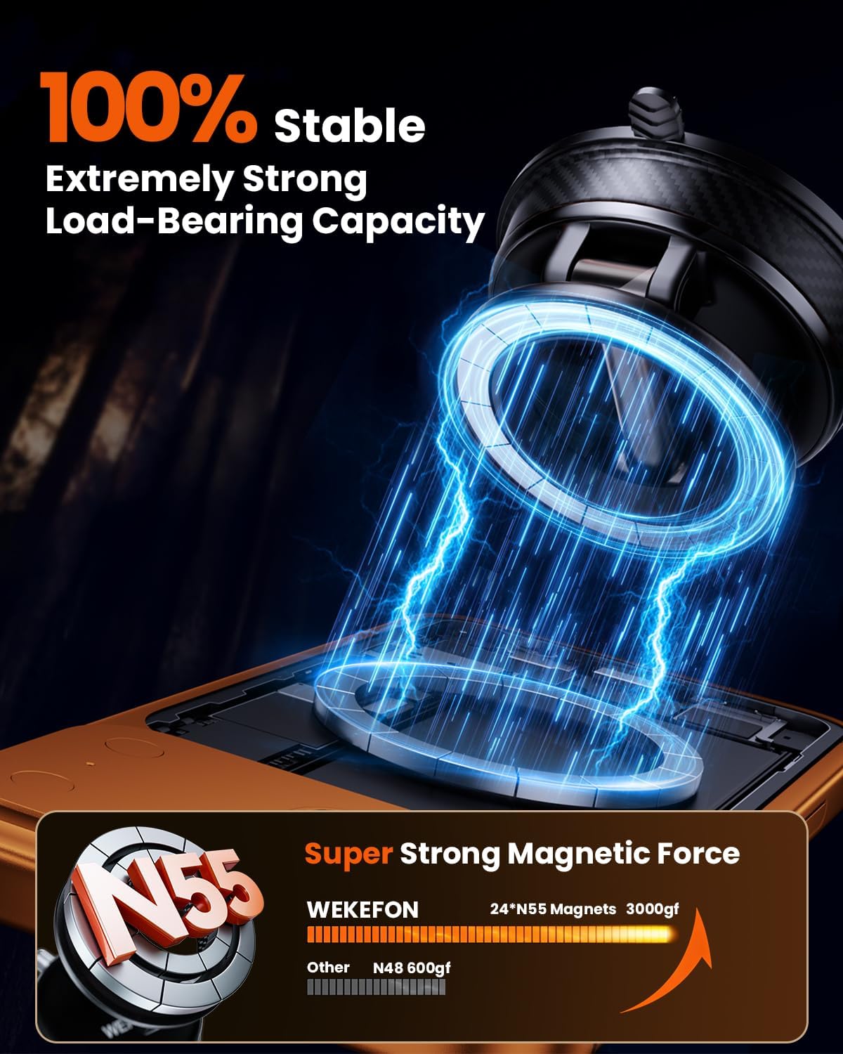 【N55 Ultra-Strong Magnetic & Unshakable Stability】Engineered with 24 high-performance N55 magnets in a precise dual-ring array, this mount delivers a magnetic force over 300% stronger than that of standard magnets, generating a powerful 3000-gram grip. Verified by 10,000 laboratory vibration cycles and extreme road condition simulation tests, the phone remains rock-solid when encountering bumpy roads, sudden braking, and sharp turns. Zero interference with mobile signals, GPS, and wireless charging