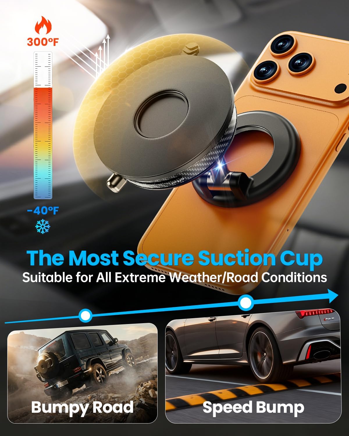 【Dual-Core Vacuum + Nano-Gel for Max Stability】This car phone mount combines a 4-layer high-tack nano-gel pad with vacuum suction technology. Compared to traditional press-on mounts, it offers an 80% stronger grip and a remarkable 120 lbs (54 kg) load capacity. It has been proven through extreme temperature tests (-40°F to 300°F), over 9,999 durability cycles, and 500+ repeated installations to maintain stable, long-lasting performance. Unshakable stability on bumpy roads and through sudden stops