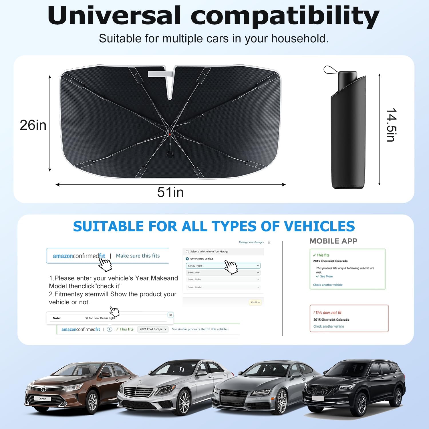 [Perfect Fit for 98% of Car Models]: This sun shade for car windshield is available in three universal sizes to ensure compatibility with almost all car models: Small: 52″L x 31″ W; Medium: 57″L x 33″W; Large: 61″L x 35″W; You can use Amazon’s MyFitment tool to verify whether the sunshade for car windshield is compatible with your vehicle.