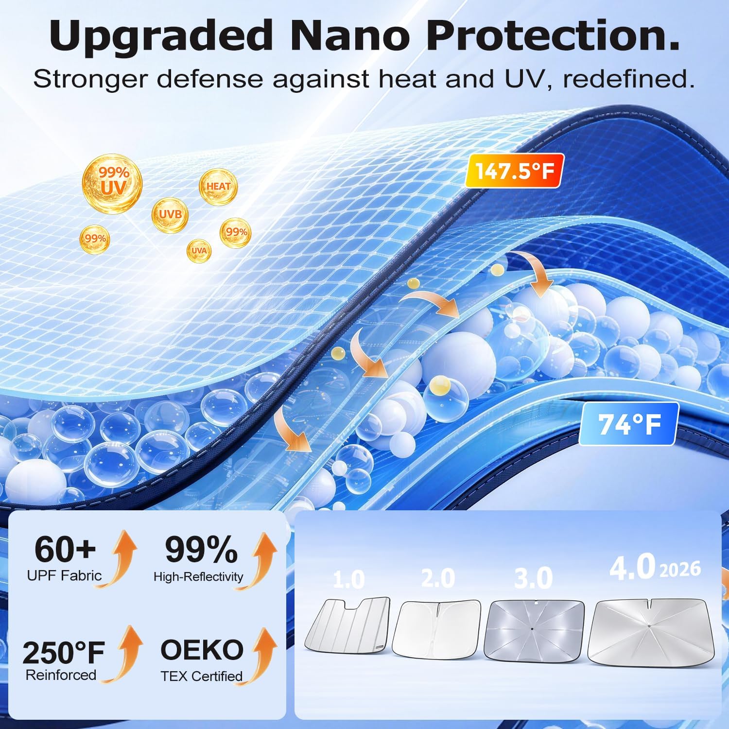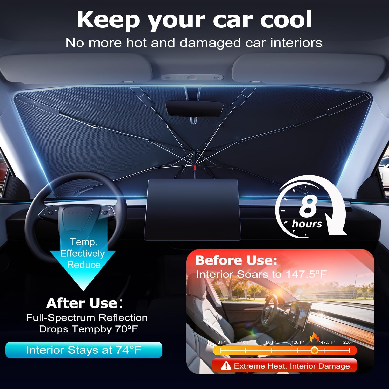 [2026 Stay Cool, Drive Comfortably]: Say goodbye to hot seats! As efficient as a portable iceberg. Our 2026 windshield sun shade uses upgraded ice crystal cooling material to evenly disperse heat to the awning, minimizing solar radiation. Quickly cools to 45°F, keeping car seat/wheel temperature below 90°F even in high temperatures of 115°F. Travel with ease and stay comfortable all summer long.