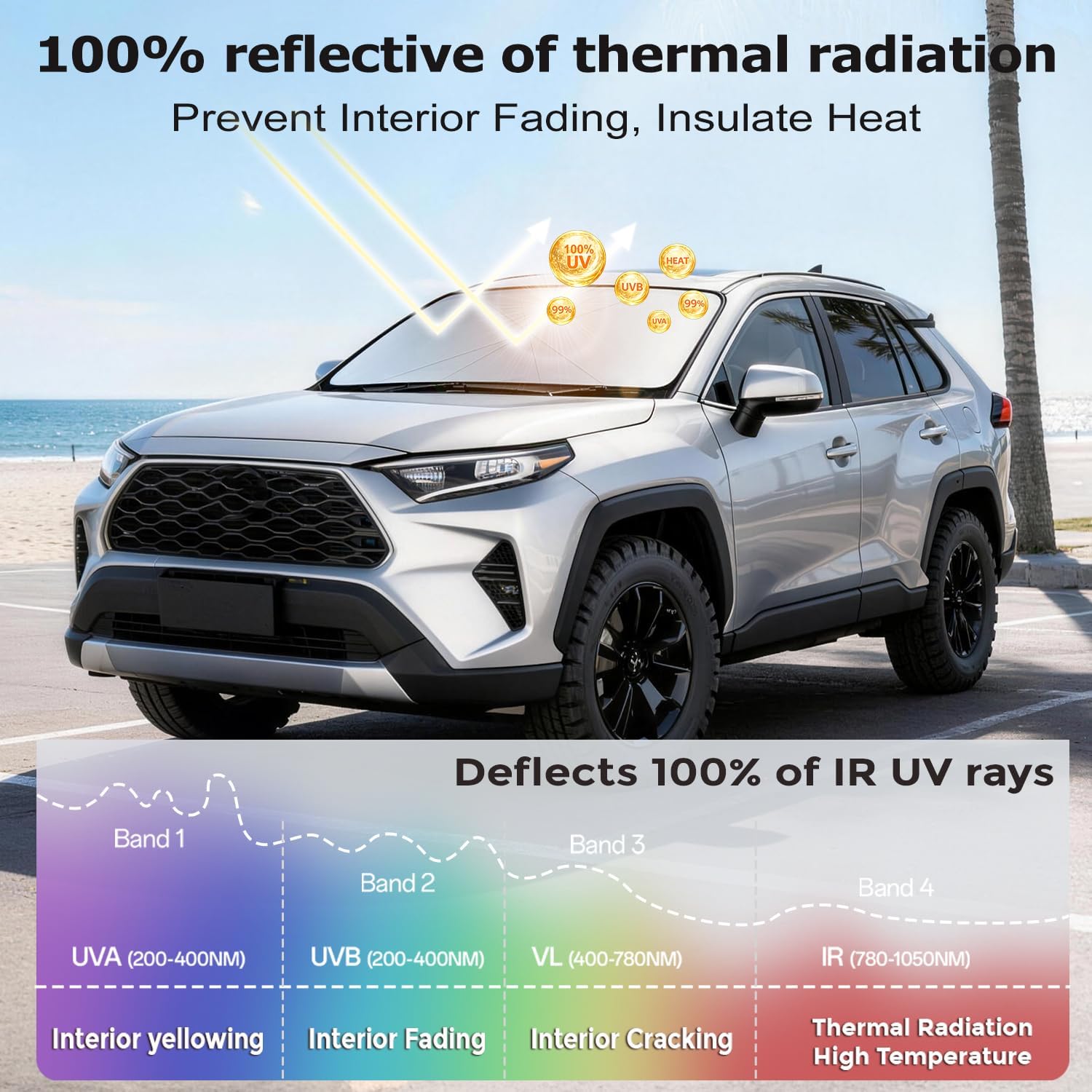 [100% UV Refraction, Car Protective Shield]: Our car sun shade uses a multi-layer reflective coating that not only blocks UV rays, but also refracts light like a diamond and scatters sunlight, just like a “sunglass” for your car. Blocks 100% of UV damage – prevents light damage, protects your dashboard, seats and interior from fading, cracking, and wear.