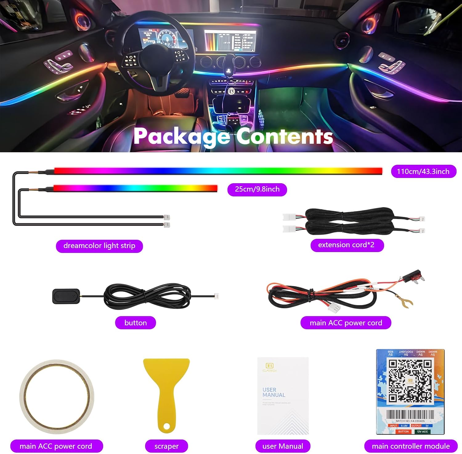 【Upgraded Acrylic 10-in-1 Car Ambient Light】 This interior car LED light consists of 6 acrylic fiber optic light strips(1*14inch+4*29inch+1*43inch, with 593 LEDs), 4 under dash lights, one master controller and 4 slave controller, which can be flexibly installed in any car without clutter.