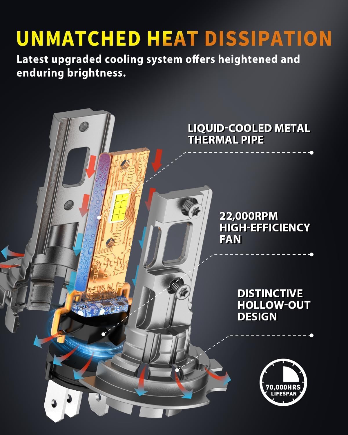 【UNMATCHED POWERFUL PERFORMANCE】Well-built premium aviation aluminum body, thermostatic copper plate, and 20,000RPM superpower cooling fan form an efficient cooling system to quickly cool the H7 driving light bulbs and ensure stable and continuous operation, extending the average life of each light to 80,000Hrs.