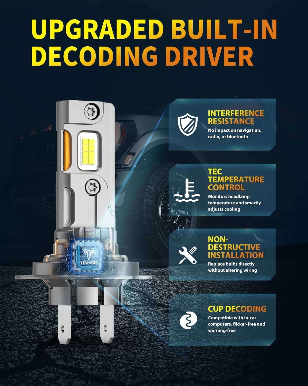 【1:1 SIZE & EASIER INSTALLATION】Unlike most bulbs available in the market, our H7 bulbs are designed as an all-in-one solution without the need for an external driver box or wires. This unique design ensures that they are the same size as halogen bulbs, which solves common installation issues such as dust cover problems.