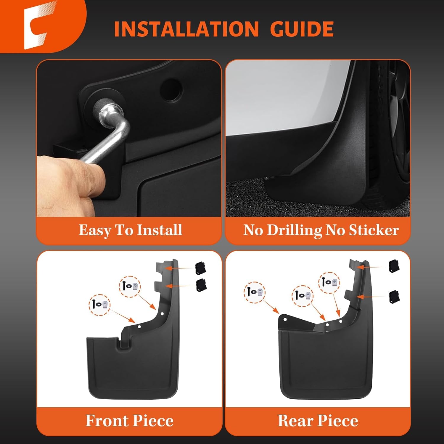 Easy Installation: Simply align the original mounting holes and secure with clips—no drilling or tape required. The splash shields feature precision hole patterns that engage seamlessly with your Ford F150, reducing the risk of damage to your car’s paint. Clear installation videos are provided in the package and product listing to guide you step-by-step. Following the video makes the installation easy and quick, ensuring a perfect fit and fast protection.