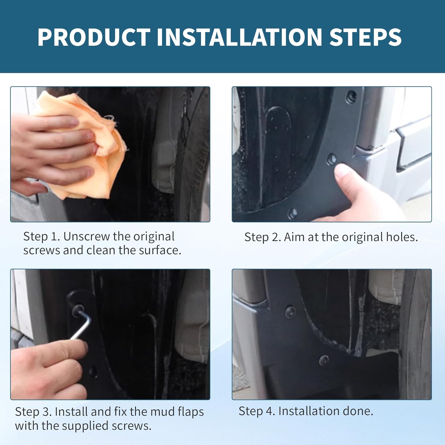 EASY TO INSTALL: No drilling required,just install in the original hole position. The package includes 2 * Front Mud Flaps; 2 * Rear Mud Flaps; 1 * Installation Tools Pack; 1 * Product Install Guide.