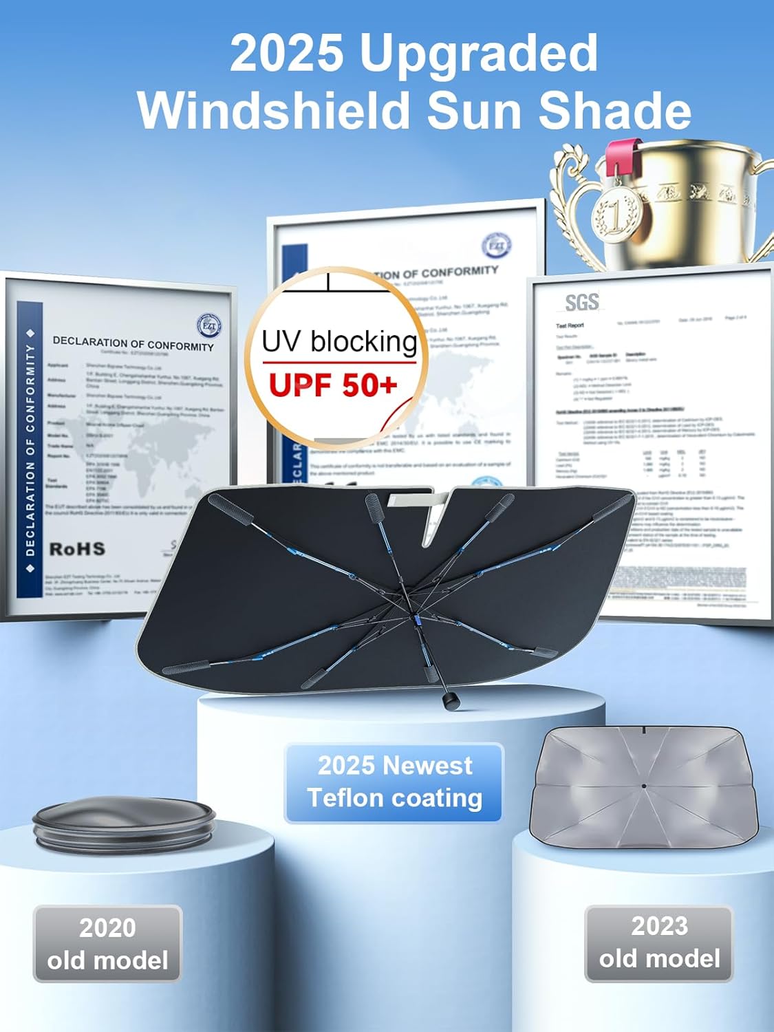 【Advanced Sun Protection】Unlike traditional silver-plated fabrics, this sunshade uses a premium 240T high-density base fabric and a polyester reflective cooling coating. This advanced combination provides excellent protection against a wide range of harmful UV rays, protecting your car dashboard and seats from damage.