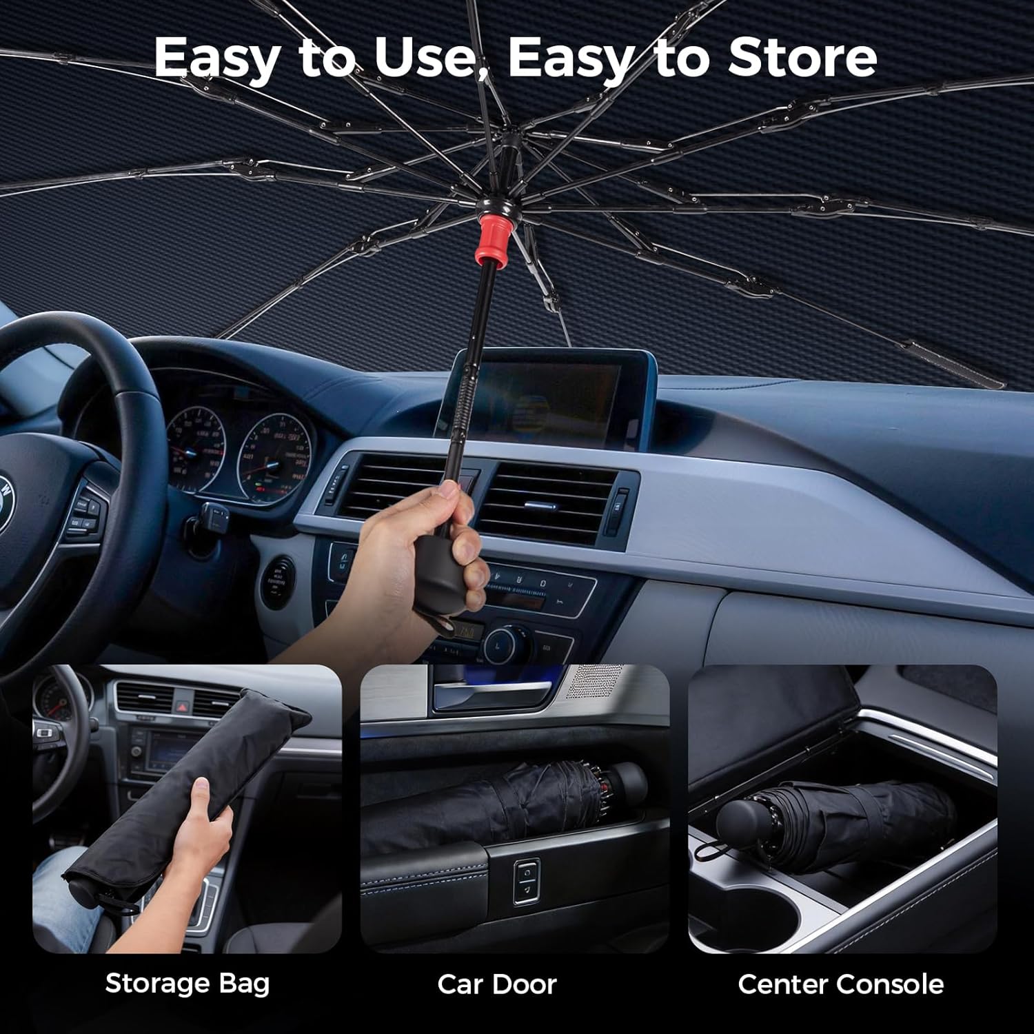 1-Second Setup, Ultra-Compact Storage: Unfold and install in one second, just like an umbrella! This windshield umbrella pops open to cover your windshield instantly and collapses into a compact size when done. Store it neatly in the included holster under your seat or in the door pocket—ultimate convenience for every drive.
