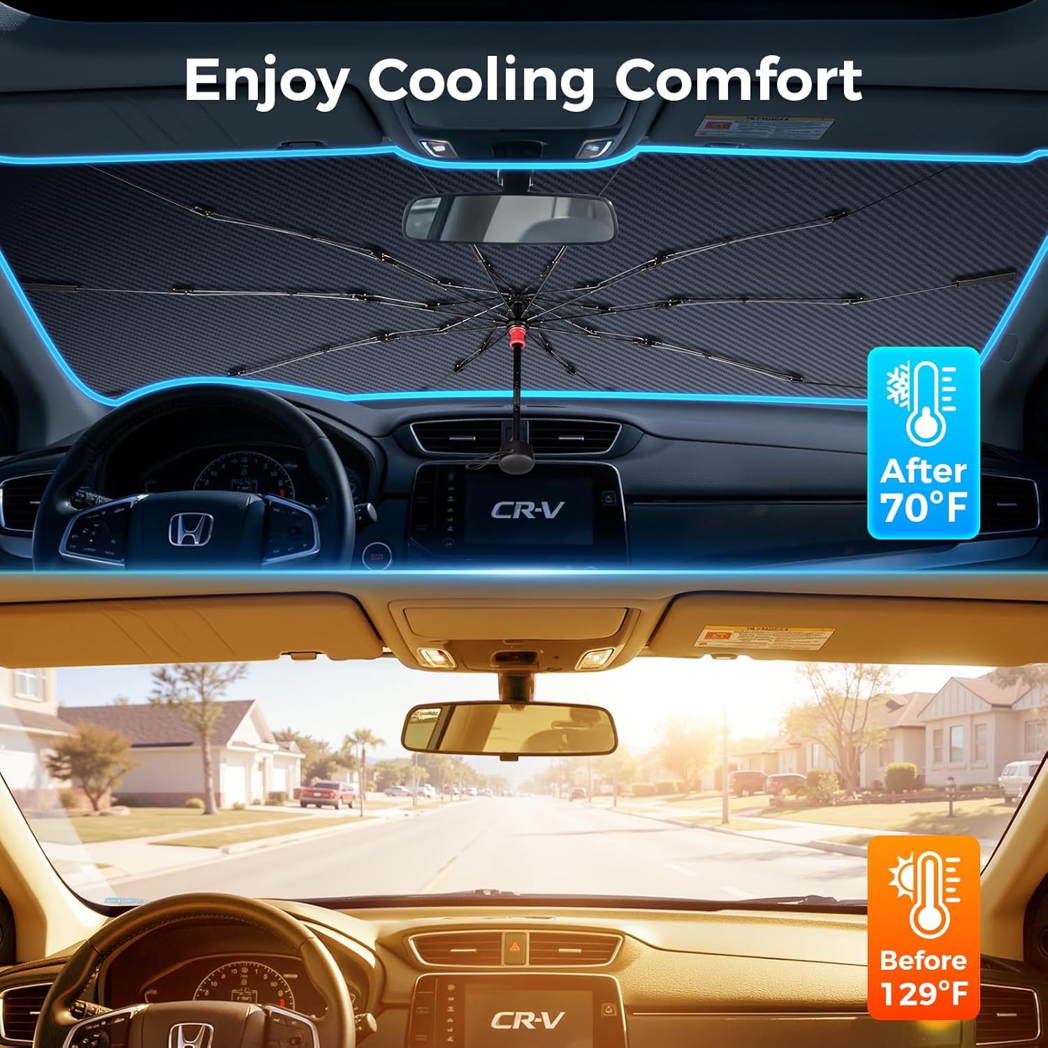 Instant Cool Zone in Seconds: Our Windshield Sun Shade Umbrella uses advanced 2-layer cooling tech to block 95% of UV rays and slash interior temps by up to 70°F. Protect your dashboard and seats while stepping into a refreshing, cool car every time. It’s the ideal car sun shade windshield for summer.