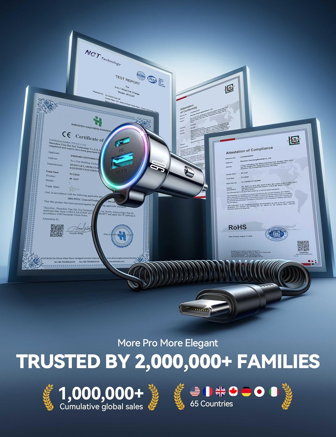 [45W Upgraded Fast charging Built-in Cable] FLYLEAD Cigarette lighter USB charger with retractable 5 FT Built-in 45W fast charge coiled cable, no need to carry an extra fast charging cable during your commute or travel in the car, built-in retractable coil cable keeps your in-car cable management more tidy and reduce driving risk. Upgraded 45W output quick charge charging cable super fast charge for newest iPhone 17/16 Series, iPhone 15 Series, and Samsung S25/S24/S23 Series phones, newest fast charging technology keeps pace with the times. [Note: For iPhone 14 Series and earlier models, please use your original Lightning charging cable with the PD/QC ports to activate fast charging.]