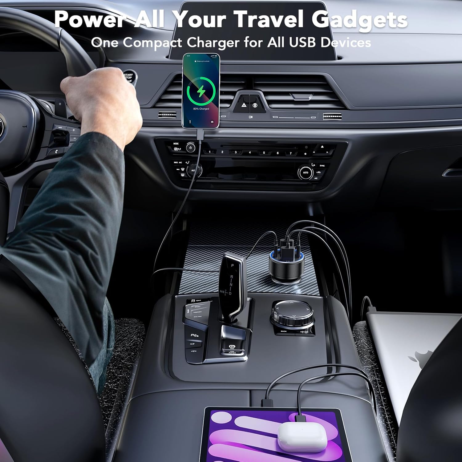 4 Port Car Charger : Car charger adapter features 2 USB C ports and 2 USB A ports, allowing you to charge up to four devices at once. Designed for phones, tablets, and other USB-powered devices, this cigarette lighter USB charger supports PD 3.0, PPS, QC 3.0, AFC, and FCP charging protocols for efficient multi-device charging