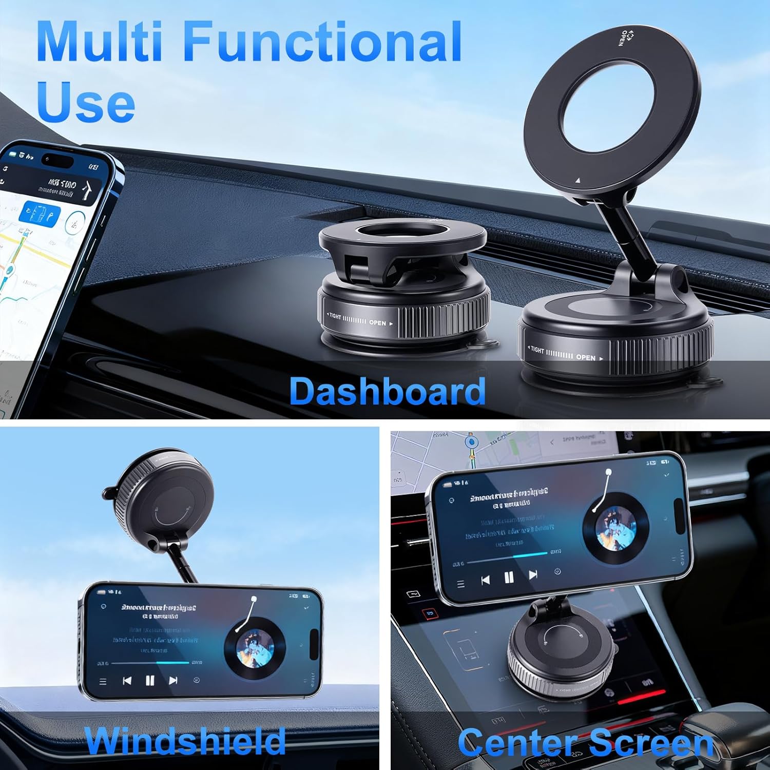 I’ve tried a lot of car phone mounts, but this Vacuum Magnetic Suction Car Phone Holder is easily one of the best. The suction base is surprisingly strong — once it’s on, it stays on, even on bumpy roads. The magnetic hold is powerful enough to keep my phone secure without wobbling or sliding, and it works perfectly with different smartphones in my household.The 360° adjustable rotation is a huge plus. Whether I’m using GPS, taking hands-free calls, or letting a passenger watch something, it moves smoothly and stays exactly where I position it. The foldable design also makes it easy to tuck away when not in use, so it doesn’t clutter up the dashboard.Overall, this mount is sturdy, compact, and extremely user-friendly. If you want a hands-free, no-hassle phone holder that actually does what it claims, this one is worth it and the price is unbeatable. Highly recommend!