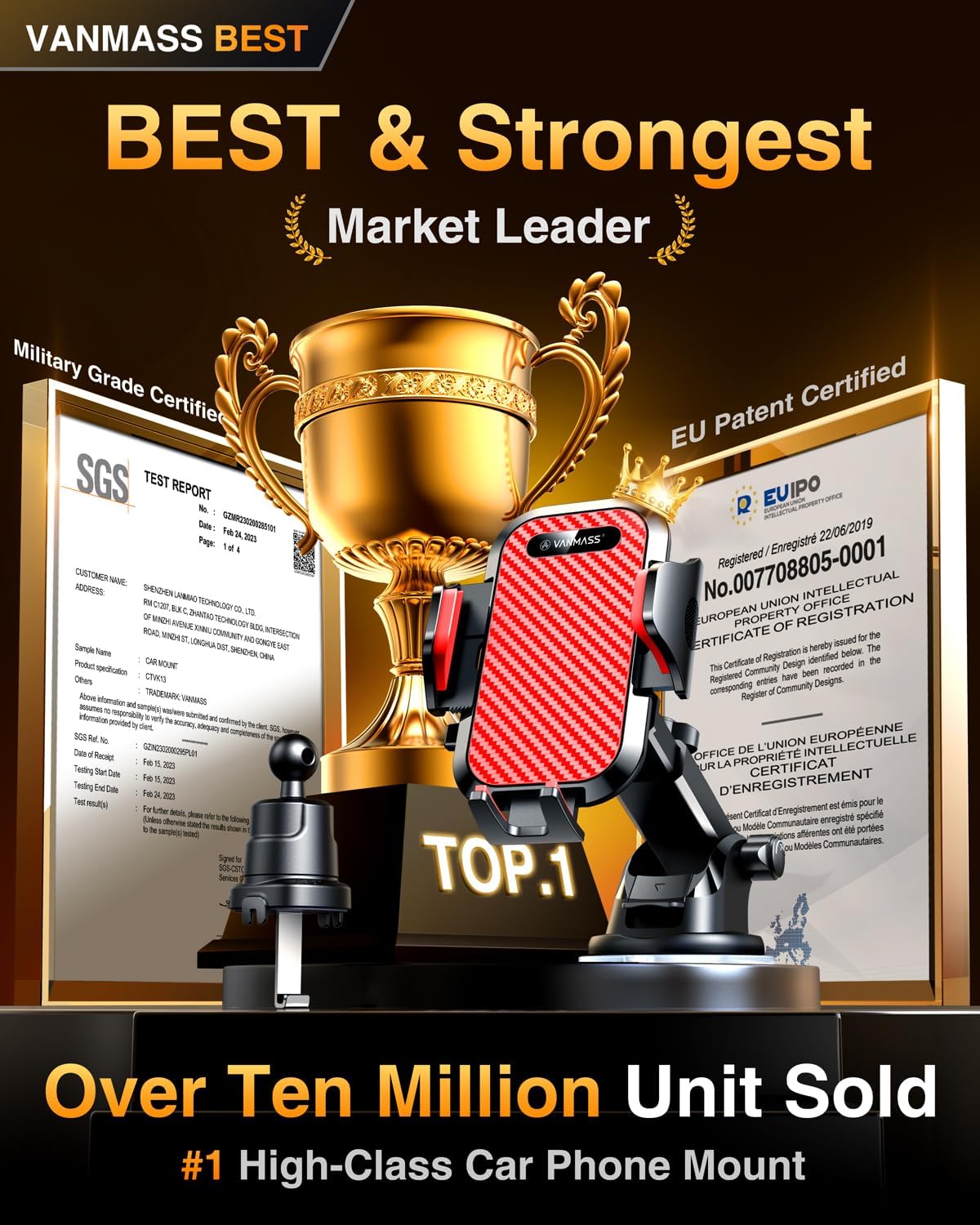 【True Military-Grade, Version 6.0 BEST Ultimate Model】The leader in high-end car phone holders. Rigorously tested to meet MILITARY GRADE standards – reliability, stability, integrity, longevity, security, durability. Overcome all weaknesses to design the version 6.0 Ultimate holder with international military-grade shockproof certification No. GZMR220601855501. This VANMASS car phone holder obtained CP65 / REACH / RoHS safety certifications