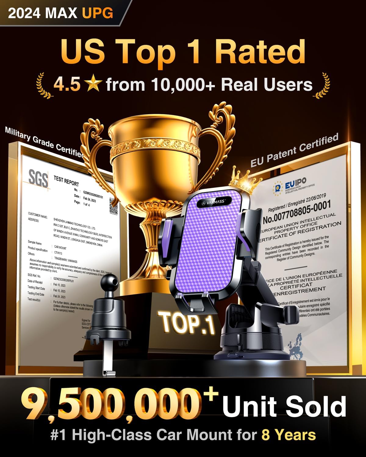 【True Military-Grade Certified, Upgraded Ultimate Car Mount】VANMASS, the leader in high-end car phone holder. Over the past 8 years, We have listened to the voices of millions of users, rigorously tested to MILITARY GRADE standards (stability, compatibility, flexibility, security, durability). Finally, we overcome all weaknesses to design the Ultimate Model that we are most satisfied with. This item obtained international military-grade shockproof certification No. GZMR220601855501