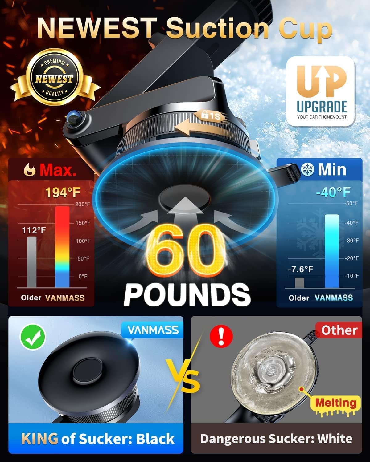 Hey y’all road warriors and daily commuters! 🚗✨I’m here to spill the tea on the VANMASS car phone holder, and let me tell you, this bad boy is the real MVP of my dashboard. I’ve gone through a slew of phone mounts over the years, and it’s been a bumpy ride (pun totally intended) until I got my hands on this gem.First off, this beauty is rockin’ some True Military-Grade Certification! 🎖️ We’re talkin’ MILITARY GRADE, folks – stability, compatibility, flexibility, security, durability, you name it! The VANMASS team ain’t playin’ around; they’ve listened to our cries for the ultimate phone holder, and after 8 years, they’ve crafted what I’d call the “Ultimate Model.” This beast has international military-grade shockproof certification, which is basically the Chuck Norris of phone mount certifications.Now, let’s chat about that suction cup. 🌪️ VANMASS upped the game from 2.5in to a whopping 2.8in diameter. They’ve slapped on some PU adhesive magic that makes the suction power skyrocket by 44%. I mean, this thing clings to my windshield like a superhero in a typhoon! And it’s not just for show – we’re talking 60 pounds of suction strength. Plus, it’s a breeze to wash and reuse, and it sticks directly to the dash without any pesky pad!But wait, there’s more! This Multi-Function Phone Stand isn’t just a one-trick pony. Dashboard, windshield, air vent? It’s like the Swiss Army knife of phone mounts! And that Longer & Firmer Hook Clip fits 99% of vents out there. The hooks are like a bear hug for your air vent – no more wobble, no more sag, just pure, unadulterated stability.We’re not just talkin’ about any ol’ materials here. VANMASS went all high-end on us with PC+ABS material that’s tougher than a two-dollar steak. 🥩 It laughs in the face of extreme temperatures, from -40℉ to 194℉, and UV rays? Pfft, it says “bring it on!” This phone mount is like the Terminator – it just won’t quit. It’s passed environmental reliability tests and snatched up CP65, REACH, and RoHS safety certifications like they were going outta style.But here’s the kicker – the Smoother “One-Click Release.” 🖱️ I can snag my phone with one hand, without breaking a sweat. They’ve fine-tuned the internals of this baby for an ultra-slick release mechanism that’s smoother than my grandpa’s jazz records.And let’s talk about customization. The Free Angle Adjustment with its telescopic pole and 360° rotatable ball is like having your own personal phone butler, always holding your device just the way you like it. 🎩👌Finally, this Sturdy Hold isn’t just flexing for the big phones; it’s a snug home for any device from 4 to 7 inches – yes, even the iPhone 15 Pro Max and the Samsung Galaxy S24 Ultra. The adjustable side clamps and feet are groundbreaking, and those non-slip fingerprint areas? Chef’s kiss! 👨‍🍳💋Compared to my current mount, the black suction cup looks like it will hold its appearance considerably better in the Florida sun than the transparent rubber suction I have on my current mount. It’s mounted on the corner of my windshield, allowing for ideal visibility while driving. It’s very versatile, you can mount it on the dash using the suction, as well as mount it on an air vent using the clip that comes with it.So, to all my peeps out there looking for the crème de la crème of phone holders, the VANMASS car phone mount is your huckleberry. Whether you’re cruising down Route 66 or just hitting the local grocery store, this is the trusty sidekick you need.Peace out, and happy driving! 🚘✌