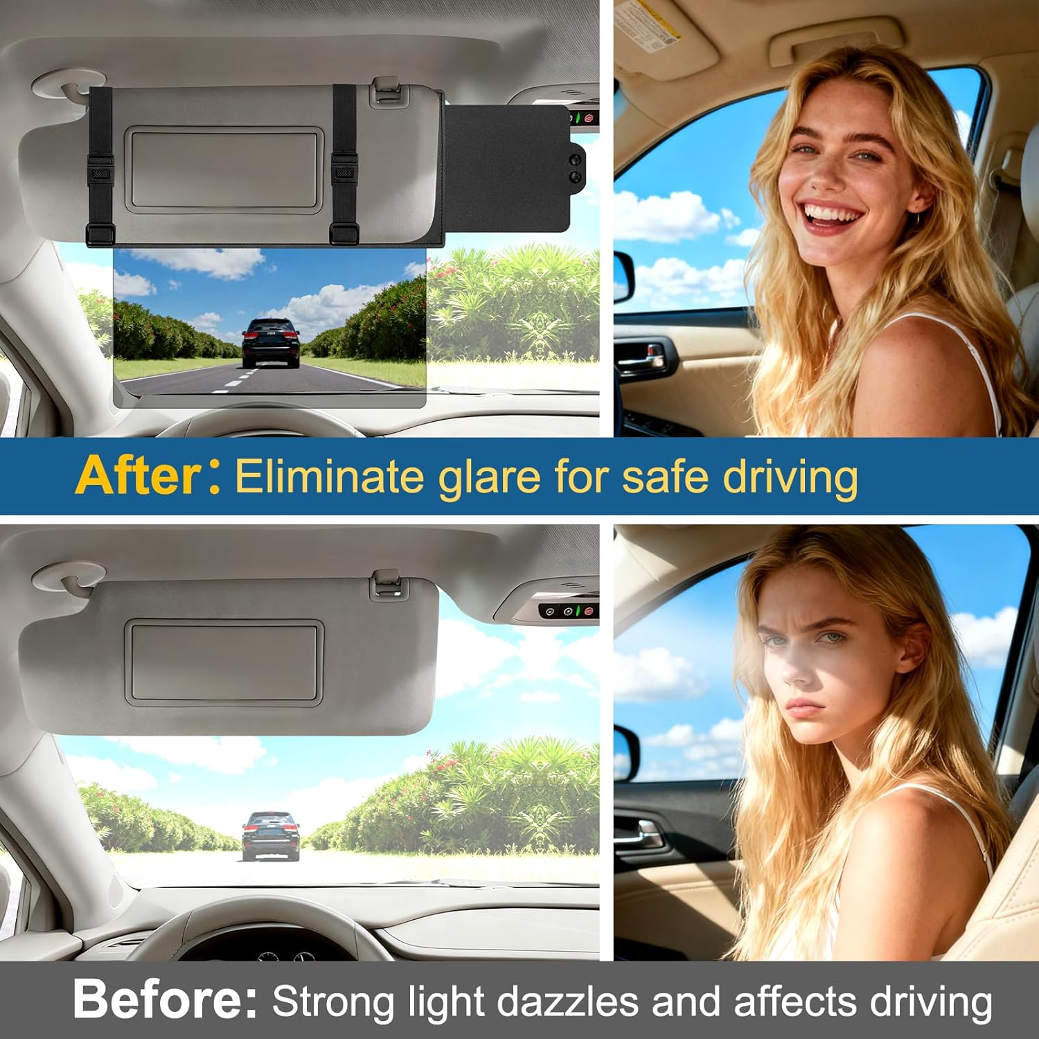Flexible Strap and Strap Adjuster Enhance Stability: Our innovative strap and strap adjuster design of the polarized sun visor extender for car ensures a secure hold. After installation, slide the adjuster to tighten the strap, which can firmly secure the sun visor extension to the sun visor, regardless of weather or road conditions.