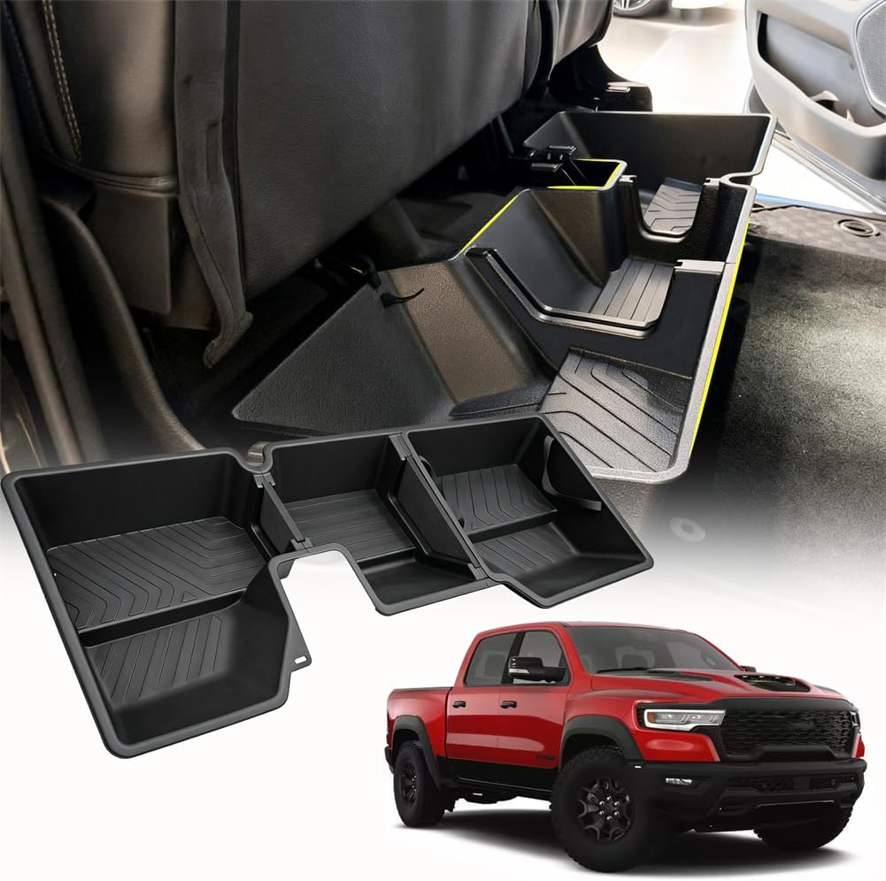 Bought for my 2024 ram crew cab for rear seat under storage and it fits great and holds a lot of stuff and it allows rear seat to sit flat without issues. It’s made of hard plastic and has a couple straps to keep it from sliding out. Little pricey but it works great