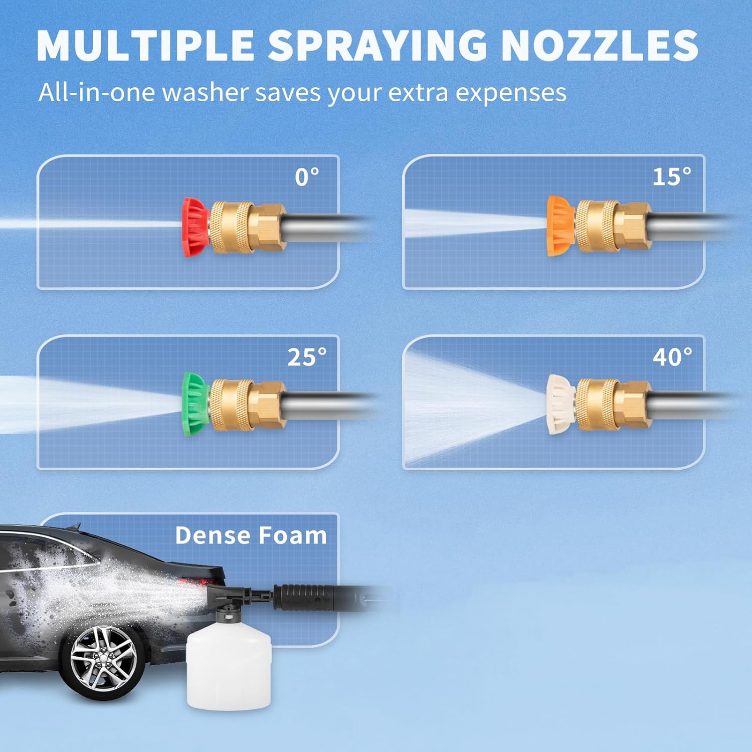 4 Nozzles for Different Jobs:The pressure washer provides 4 quick-connect metal spray nozzles ( 0°/ 15°/ 25°/ 40° ) and a 500 ml self-spraying detergent bottle for best suiting your different cleaning tasks. The water inlet filter makes the water nozzles spray smoothly without any blockage. Therefore, you do not need to change nozzles frequently, saving unnecessary expenses.
