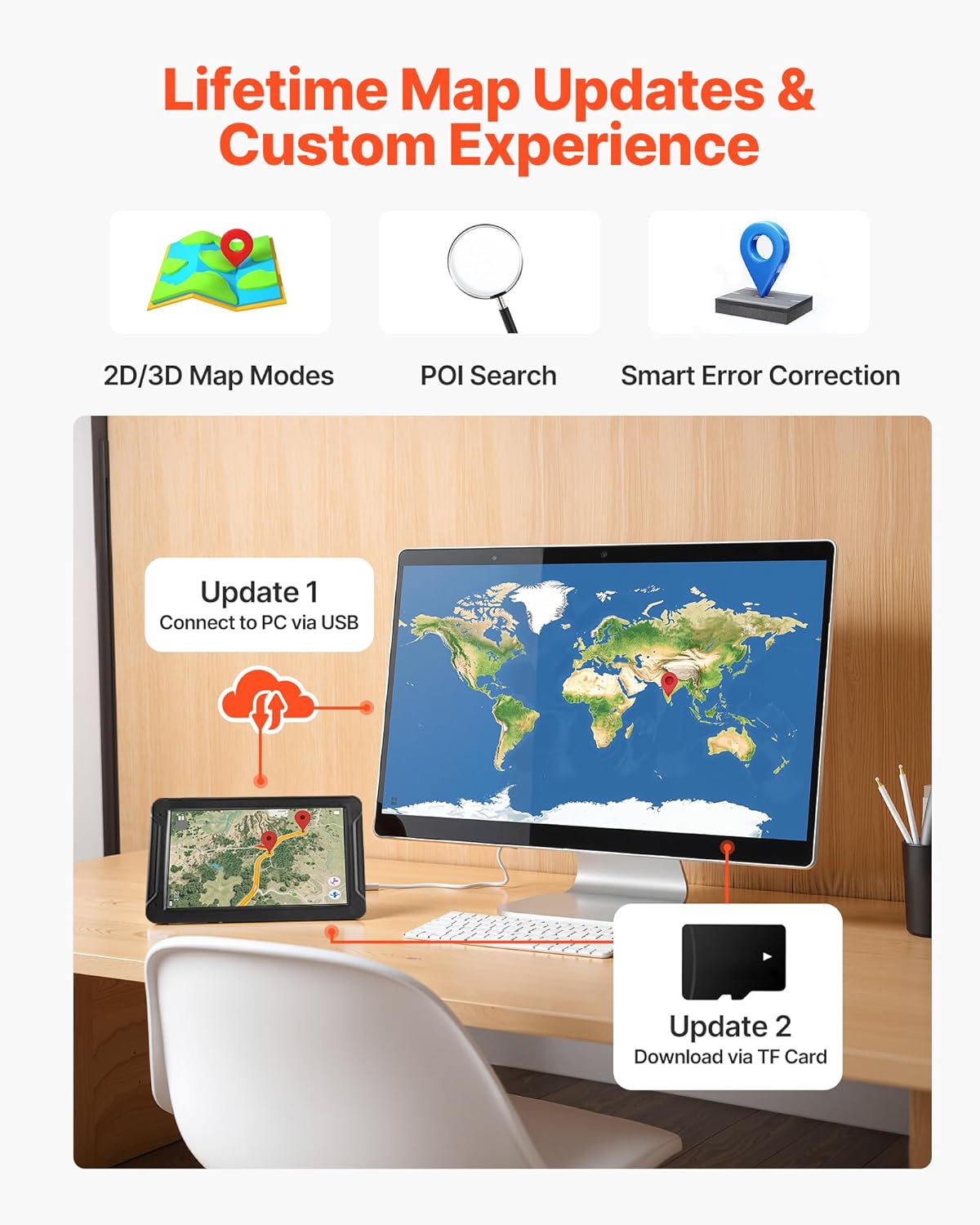 Preloaded Maps: Our car GPS comes with 16GB storage (with 1GB RAM), TF card expandable, built-in 1200mAh battery and car charging cable. The 7″ anti-glare HD screen (800×480) features responsive touch, tempered glass, and high-brightness display