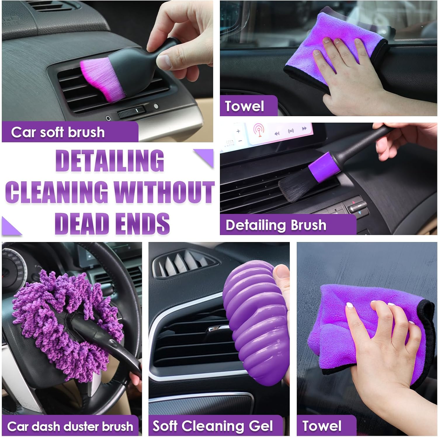 Purple Car Cleaning Kit includes: 1 portable car vacuum, 2 car dust cleaning gel, 3 mini brush, 5 detailing brush, 1 car windshield cleaner,1 spray bottle, 1 coral fleece towel, 1 car dash duster brush, 1 soft brush, 1 oxford storage bag. Perfect car cleaning kit interior to keep with you and have handy anytime you are ready to clean your car