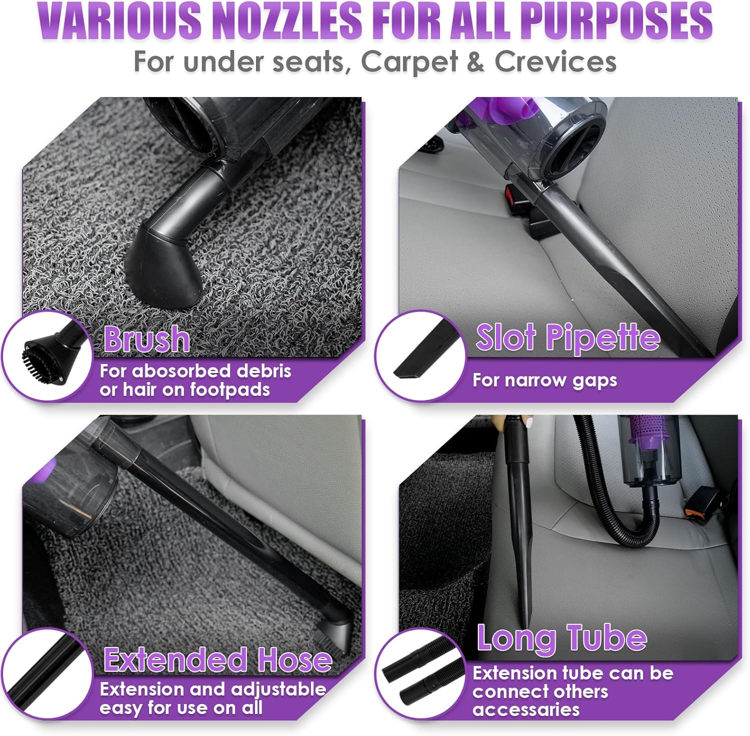 Powerful Suction and Multi-Angle Cleaning: With almost 8000Pa ultra-strong suction, the mini car vacuum can easily remove dust, sand, paper debris, pet hair or food scraps. Vacuum cleaner power cord is 15 feet long and comes with 4 accessories – slot pipette, long tube, brush nozzle, extension hose, which make cleaning car of every slot easy and time-saving