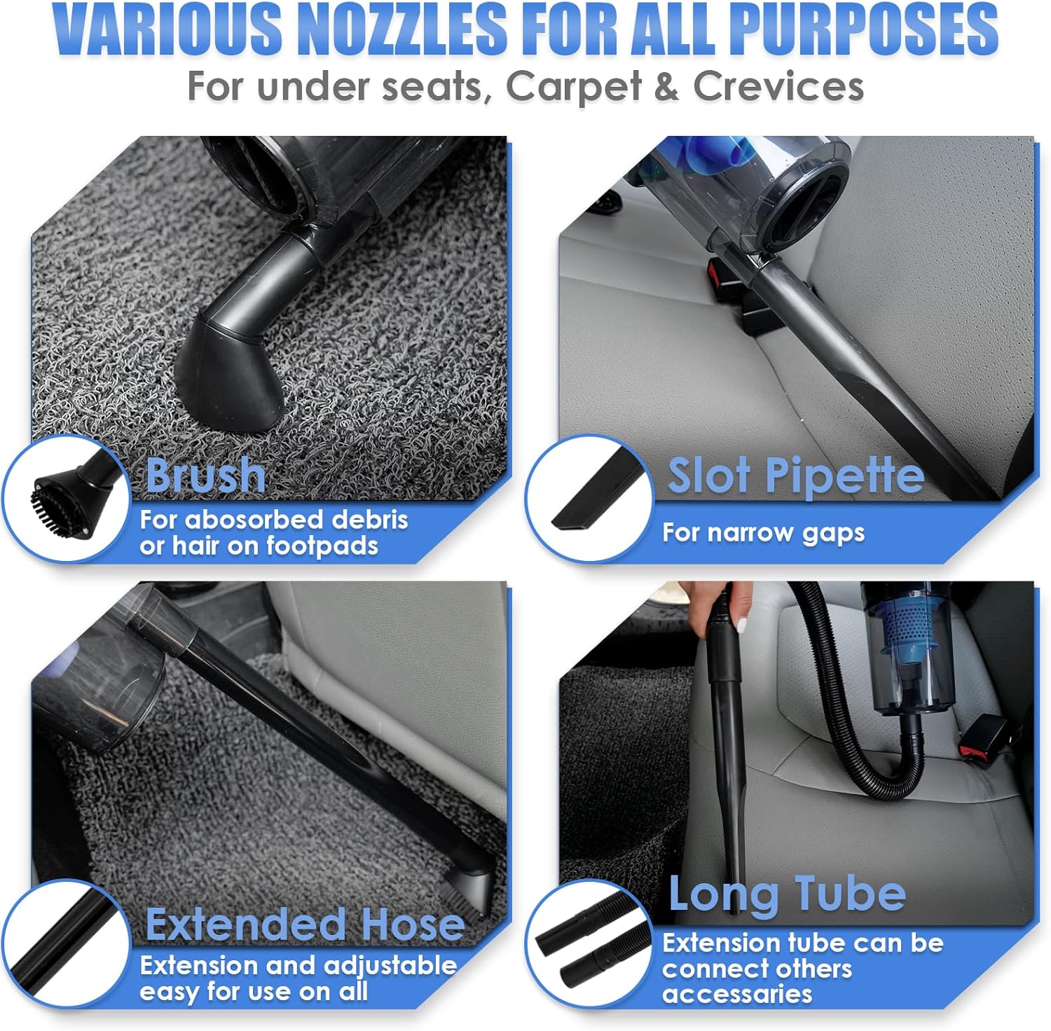 Powerful Suction and Multi-Angle Cleaning: With almost 8000Pa ultra-strong suction, the mini car vacuum can easily remove dust, sand, paper debris, pet hair or food scraps. Vacuum cleaner power cord is 15 feet long and comes with 4 accessories – slot pipette, long tube, brush nozzle, extension hose, which make cleaning car of every slot easy and time-saving