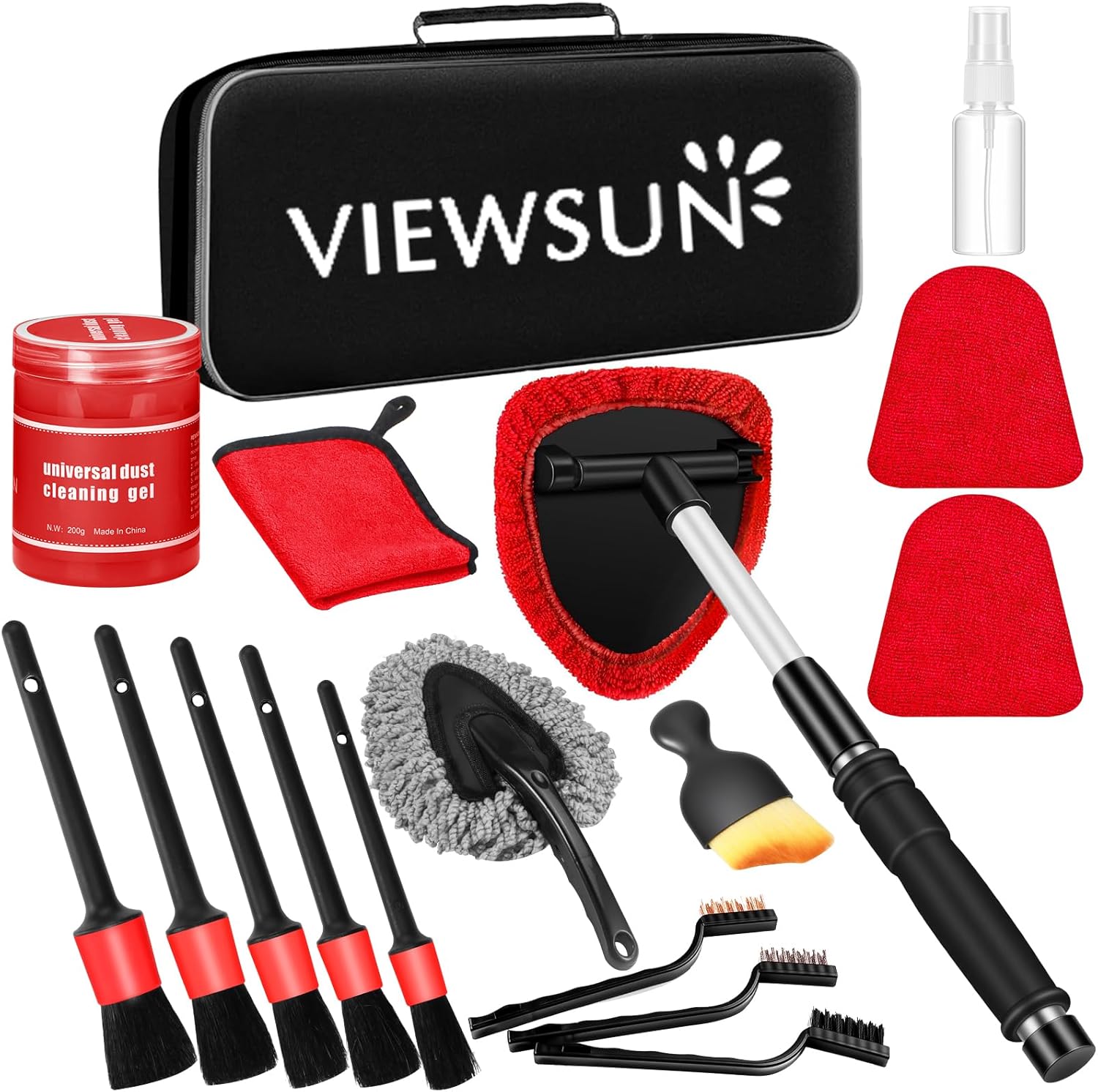 All-in-One Car Interior Cleaning Solution: Viewsun Red Car Interior Detailing Kit includes 17 essential tools: car windshield cleaner*1,replaceable microfiber pads*2, 100ml spray bottle*1, car detailing brushes*5, car dash duster brush*1, Interior Detailing brush*1, car cleaning gel*1, microfiber towels*1, mini brush*3, durable storage bag*1. The car cleaning supplies contains about everything you could need to do a good cleaning on any of your vehicles at home