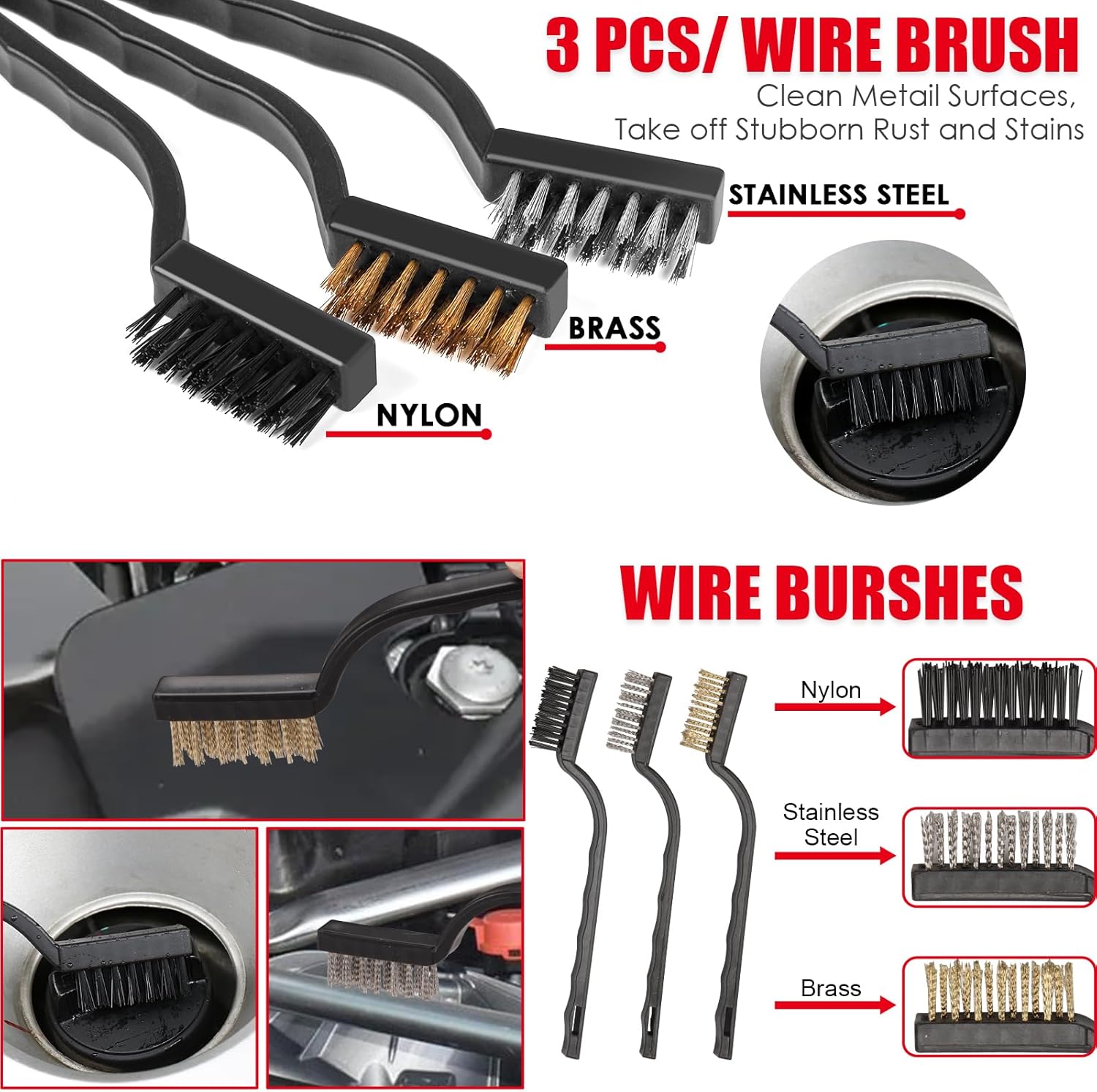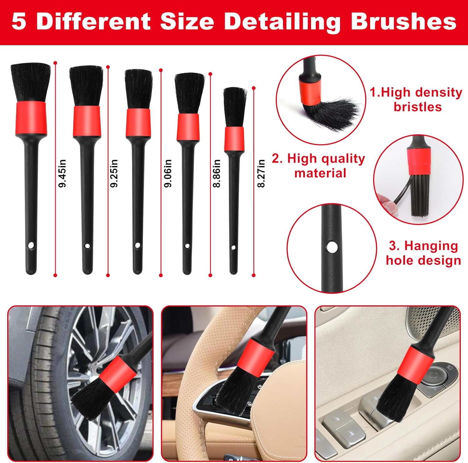 Professional Brush Kit: 3 precision-sized detailing brushes tackle every surface – small brush cleans crevices/lug nuts, medium brush handles seats/dashboards, large brush efficiently scrubs wheels/engine bays. Complete with special vent and dash dusting tools