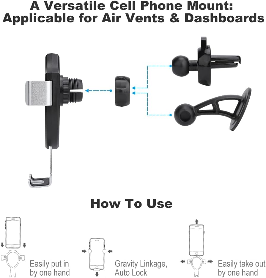 Two Mounting Options & Wide Compatibility: Includes both a suction cup and an air-vent clip for installation on the dashboard, windshield, or straight-type air vents. Suitable for 4.0 to 6.0-inch smartphones, and designed to avoid blocking your view for safer driving