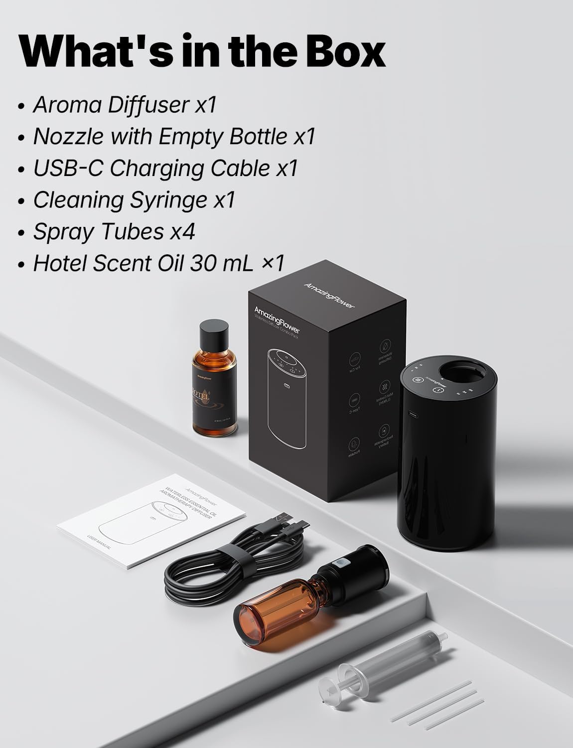 【Luxury Starter Kit with Hotel-Inspired Fragrance】Crafted for those who appreciate refined spaces, this kit includes a waterless diffuser and a 30mL premium fragrance oil inspired by five-star, design-forward hotels. The waterless, high-concentration formula delivers a clean, consistent aroma that feels elevated, intentional, and unmistakably upscale.