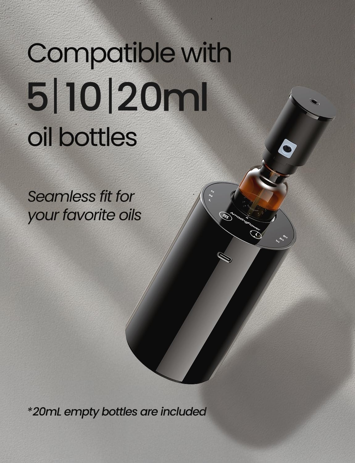 【Quick and Hassle-Free Setup with Standard Oil Bottles】Works seamlessly with US-standard 5 / 10 / 15 / 20mL essential oil bottles for fast, no-fuss setup. Simply remove the cap and either fill the included empty bottle with your favorite oil, or twist your retail oil bottle directly onto the nozzle. No pouring, no spills, no mess—just clean, effortless aromatherapy.