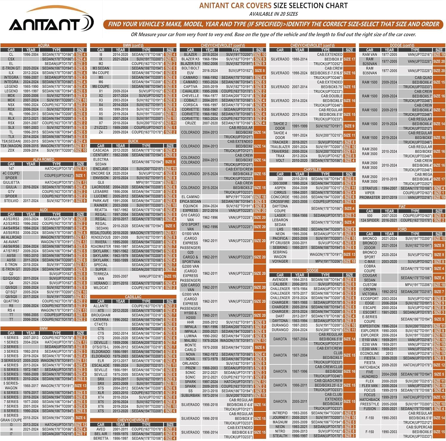 【Vehicle Dimension】- Fit for all sedan which length is 186″ To 194″.Find your car length in left picture and more car size in below detailed chart.Anitant Compatible for car cover Honda Accord car cover,Toyota Camry,Crown,Soarer,Cressida,Cadillac Caterra,CT4,CT5,ELR,Kia Magentis,K5,Optima,Stinger,Hyundai Sonata,XG300,XG350,Ford Contour,Fusion,Shelby GT350,GT500,bmw 5/6 Series,Mercedes CLS,E-Class etc.