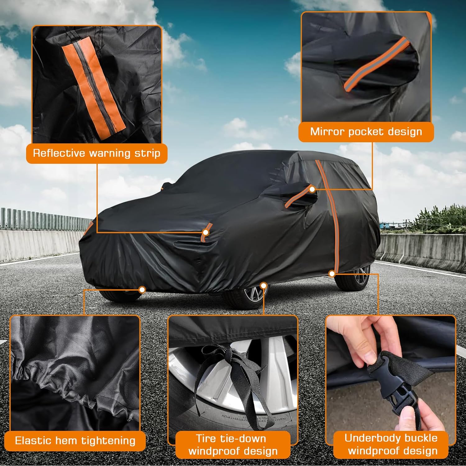 【Safety and Convenience】(1) Driver’s side zipper door for easy access. (2) Four windproof straps are sewn on the four tires to help you fasten the cover to prevent it from being blown over by strong winds. (3) Mirror pocket helps you put on the car cover easily and protects the mirrors from damage. (4) The windproof strip at the bottom passes through the middle of the car to ensure that the car cover will not be blown away. (5) The elastic hem ensures a custom fit and provides all-round wind protection. (6) Reflective strips can alert others at night. (7) Waterproof strips are pressed at the joints (2 waterproof strips).