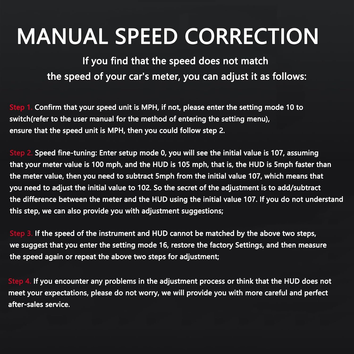 Adjustable speed: If you find that the speed does not match the speed of your car’s meter, you can adjust it as follows:Step 1. Confirm that your speed unit is MPH, if not, please enter the setting mode 10 to switch(refer to the user manual for the method of entering the setting menu), ensure that the speed unit is MPH, then you could follow step 2.Step 2. Speed fine-tuning: Enter setup mode 0, you will see the initial value is 107, assuming that your meter value is 100 mph, and the HUD is 105 mph, that is, the HUD is 5mph faster than the meter value, then you need to subtract 5mph from the initial value 107, which means that you need to adjust the initial value to 102. So the secret of the adjustment is to add/subtract the difference between the meter and the HUD using the initial value 107. If you do not understand this step, we can also provide you with adjustment suggestions;Step 3. If the speed of the instrument and HUD cannot be matched by the above two steps, we suggest that you enter the setting mode 16, restore the factory Settings, and then measure the speed again or repeat the above two steps for adjustment;Step 4. If you encounter any problems in the adjustment process or think that the HUD does not meet your expectations, please do not worry, we will provide you with more careful after-sales service.