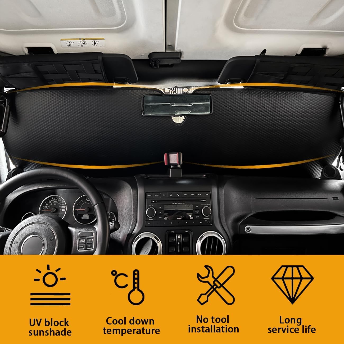 Sunlight Protection: Our windshield shade for Jeep provides over 95% UV block-out and over 90% heat reduction with Special Metalized Polyester film-laminated, ensuring effective insulation. while guarding the instrument panel to minimize fading and heat damage.