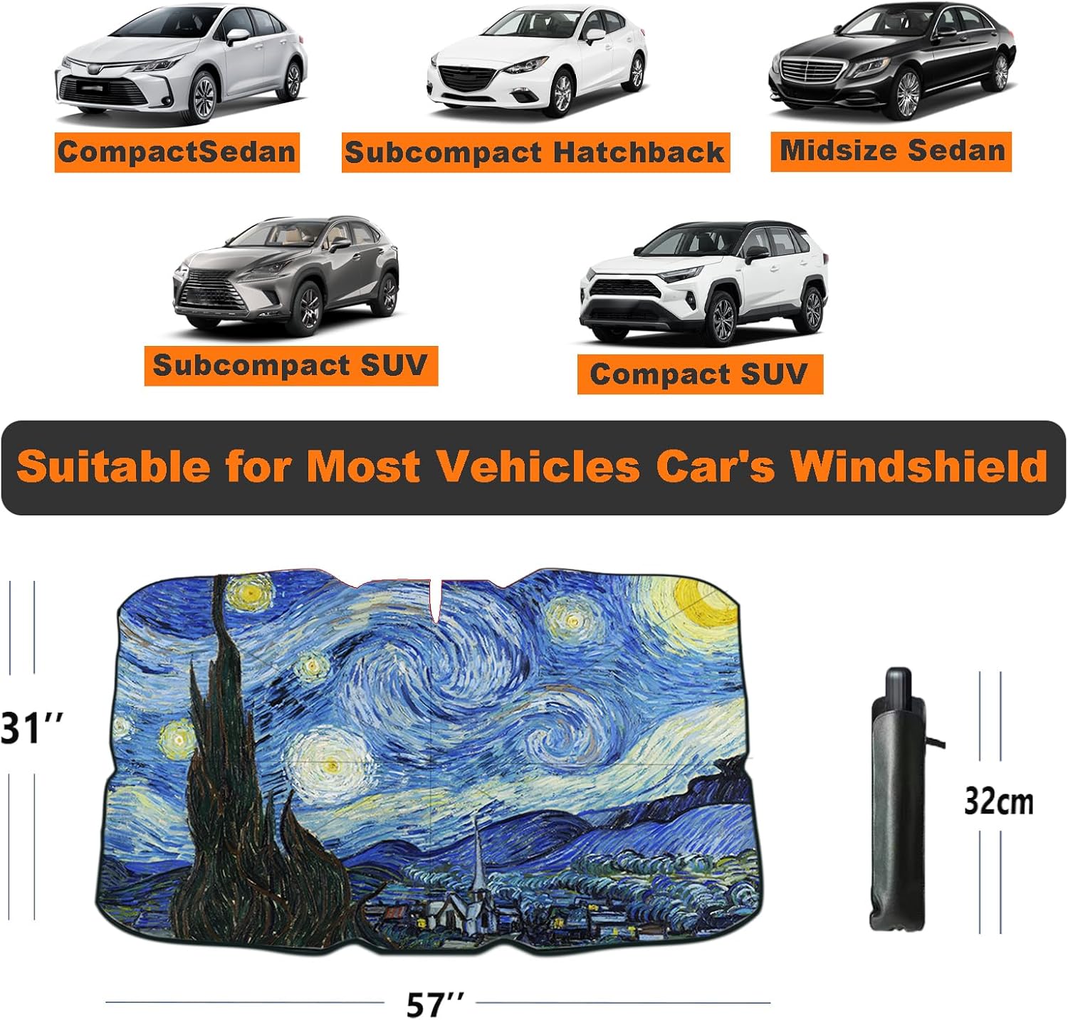 With a dimension of 57″L × 31″W, Coricha sunshade umbrella is perfectly suited for Compact Sedans, Subcompact SUVs, Subcompact Hatchbacks, and Midsize Sedans. For a full list of compatible models, please refer to Image 3.