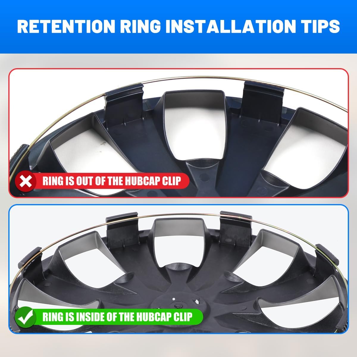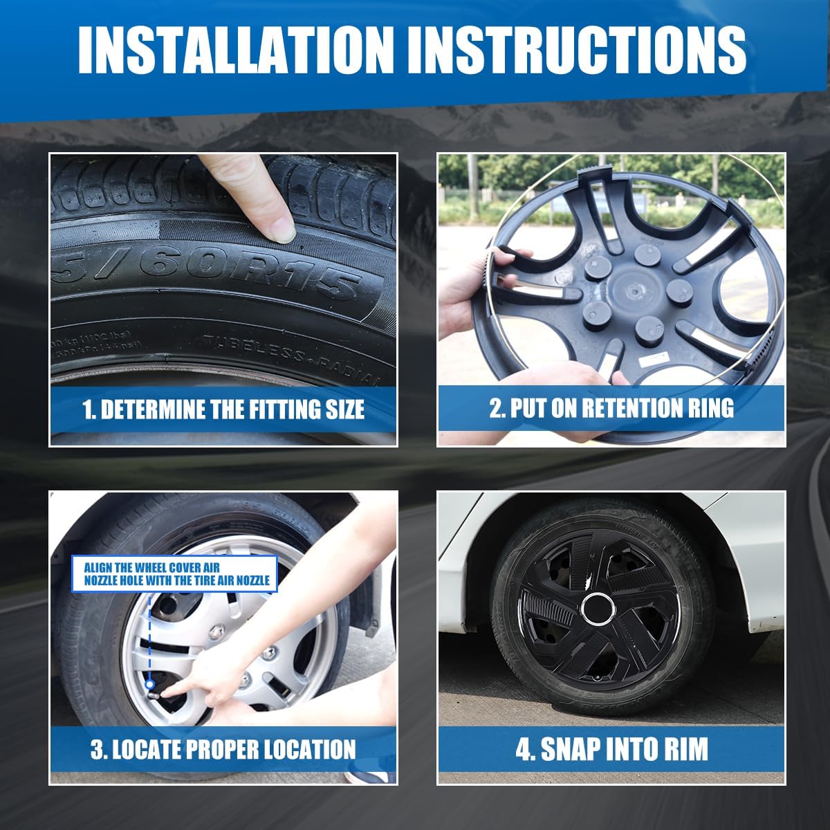 Easy Installation ➼ Align the grooves of the adjustable steel retaining ring with the grooves of the hubcap and align the hubcap with the tire valve before snapping it onto the wheel.