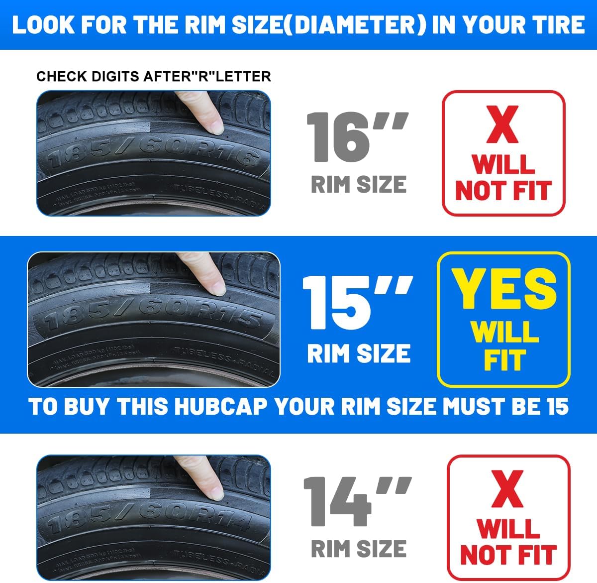 Check First ➼ Make sure you have 15″ iron & steel wheel design, Not suitable for aluminum alloy wheels.15 inch hubcaps fits most cars. Check for R15 digits on your tire. It must say R15!