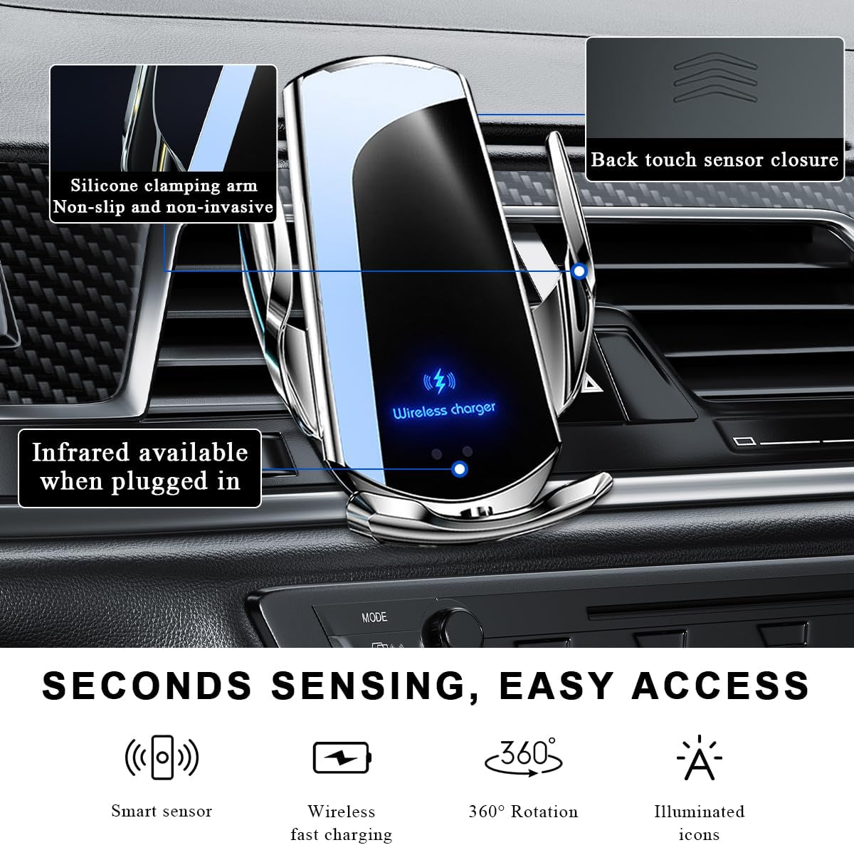 Wireless Car Charger, 15W Fast Charging Air Vent Mount Auto-Clamping Phone Holder, Automotive Electric Induction Charger 360° Rotating Magnetic Vent Mount Bracket for Smartphones (Silver)