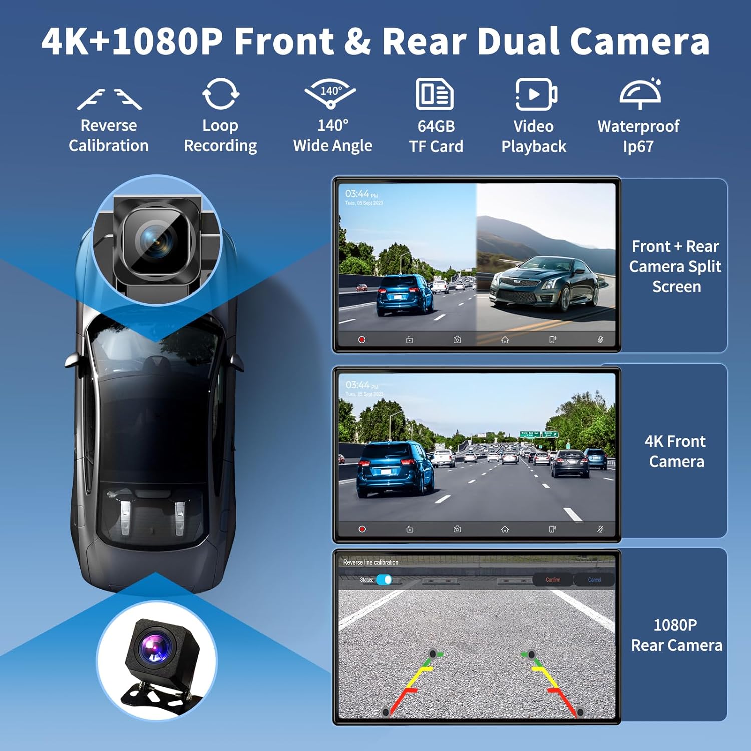 【High Definition 4K+1080P Dual Dashcam】This Wireless Portable Carplay Screen equipped with front 4K and rear 1080P waterproof cameras, it delivers detailed loop recording. No matter the day or night, car stereo with backup camera can accurately and clearly record your journey, providing a clear front view, can assist drivers in safe driving at night or in adverse weather conditions. Enjoy crystal-clear recordings and simultaneous views when reversing, ensuring safety and providing peace of mind.