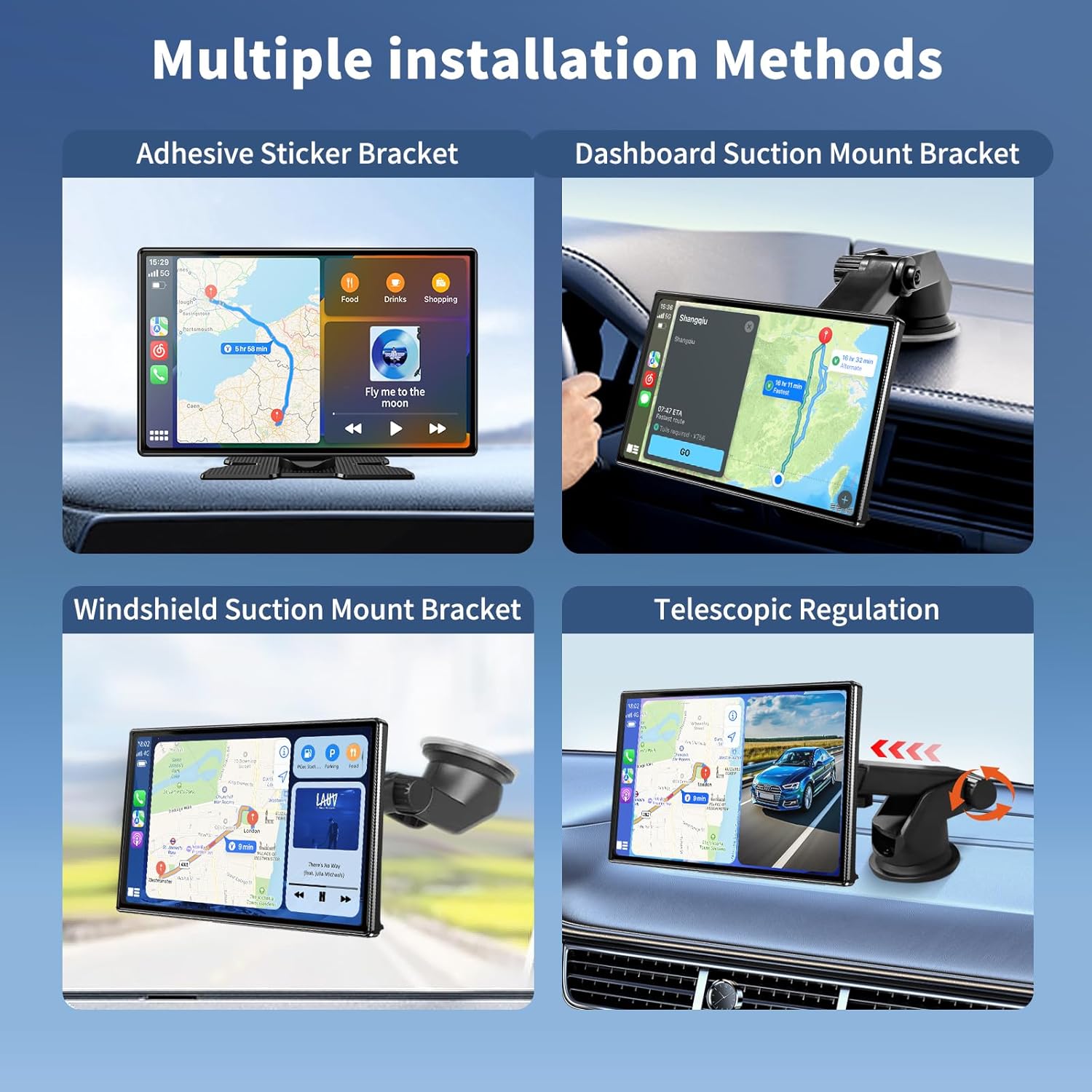 【Add Carplay To Any Car & Easy Installation】With 12V~24V of the android carplay screen for car, which fits all different vehicles, like campers, trucks. Equipped with an adjustable self-adhesive dashboard mount, simply mount 9″ android auto screen with dash cam to your dashboard, it can be firmly attached to your car and easily removed as your needs. Even if your car is so old, using portable carplay screen instantly upgrades your cars. You can effortlessly synchronise with the car touch screen.
