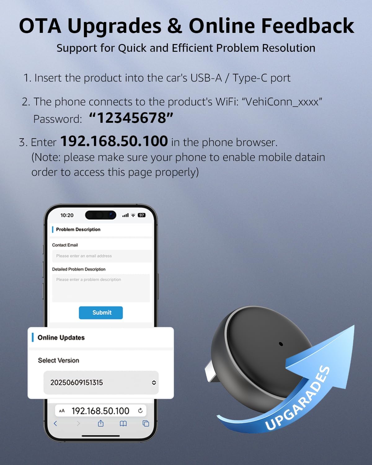【Reliable Support & Online Updates】Enjoy stable wireless connectivity and adaptive resolution to maintain your car’s native display quality. Tested by US agency for peace of mind, it’s backed by a 30-day replacement and a one-year hardware policy, along with lifetime firmware updates to ensure your device’s compatibility with your car and future features.