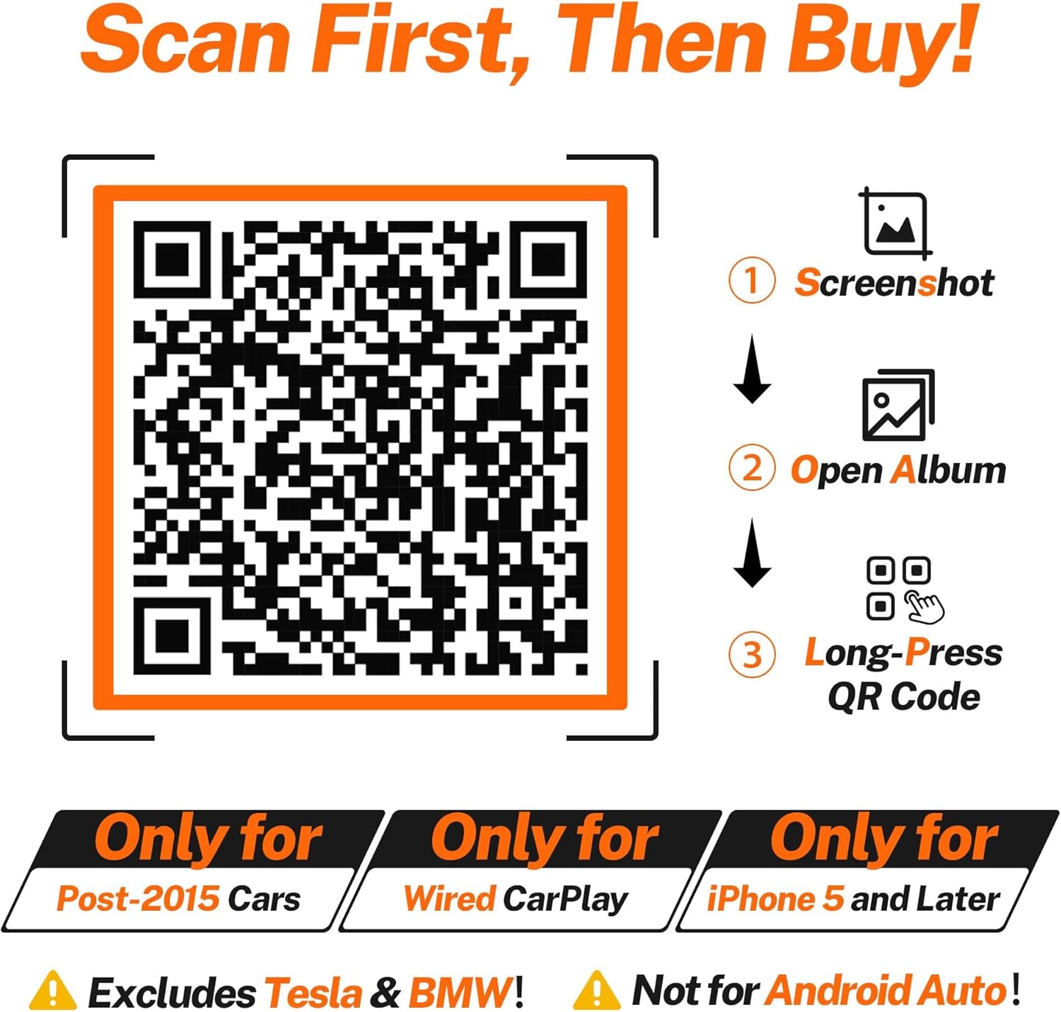 Full-Scenario Smart Compatibility: The for apple carplay wireless adapter supports all for iPhone 5 and later models (iOS 10+), works with 927+ car models (Tesla/BMW excluded), and offers plug-and-play functionality. Featuring an ultra-slim USB stick design (only 1/5 the size of a credit card), it stays discreetly hidden. Notes: ① Exclusively compatible with carplay systems (no Android Auto). ②Only supports original wired for apple carplay systems (see Image 6).