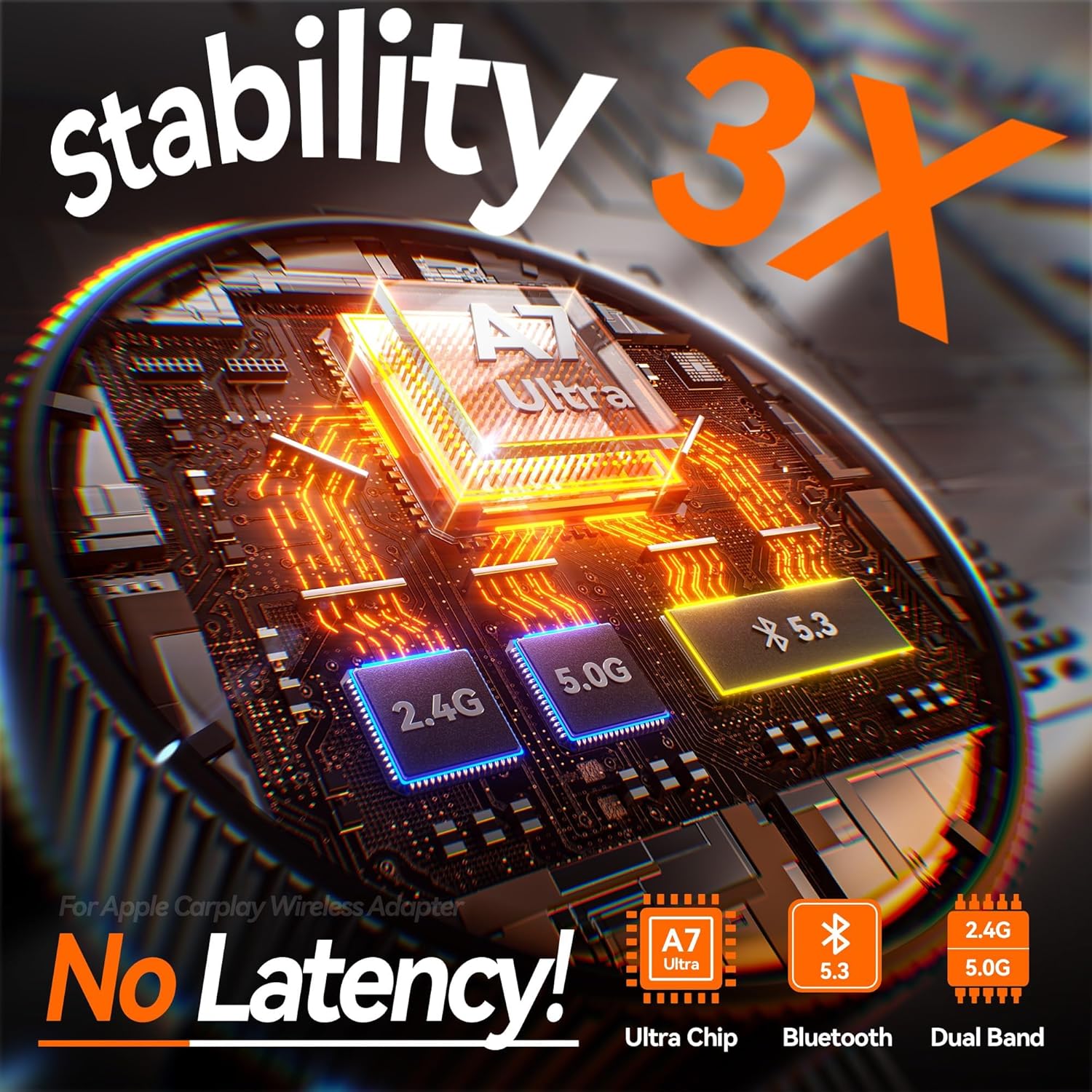 Wireless CarPlay Ultimate Solution: Break free from data cables! The car play wireless adapter features the latest A7 Ultra chip and Wi-Fi 6 dual-band technology, delivering 3x faster connection speeds. Auto-connect when entering the car, seamless operation throughout, zero audio-visual delay with perfect sync, and 100% true-to-source sound and image quality.