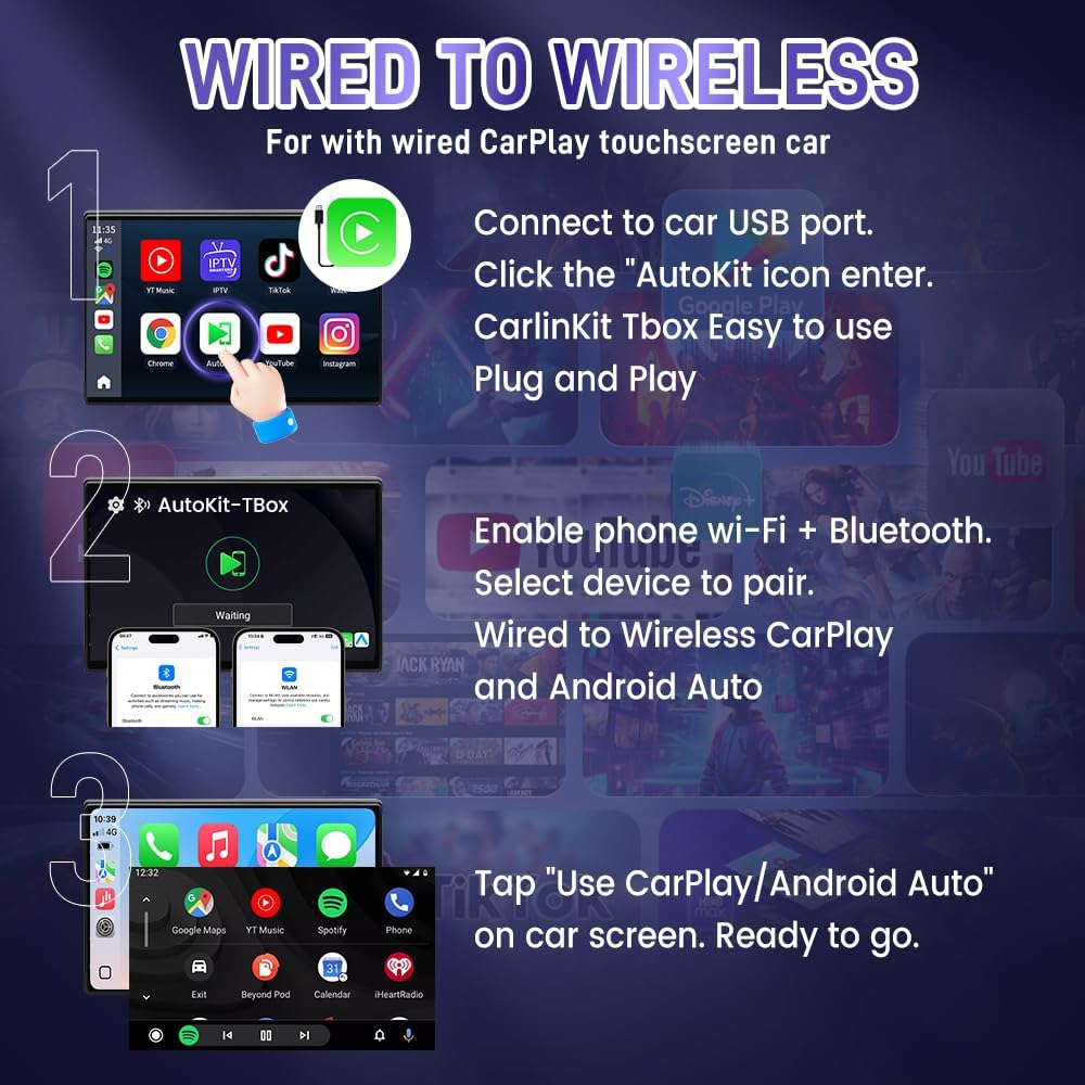 【Applicable mobile phones:】Wireless Android Auto Only Supports Android phones(Android 11.0 and above system Android mobile phones.). Wireless CarPlay Only Supports iPhone phones(iPhone 6 and above / iOS 10.0 and above.)