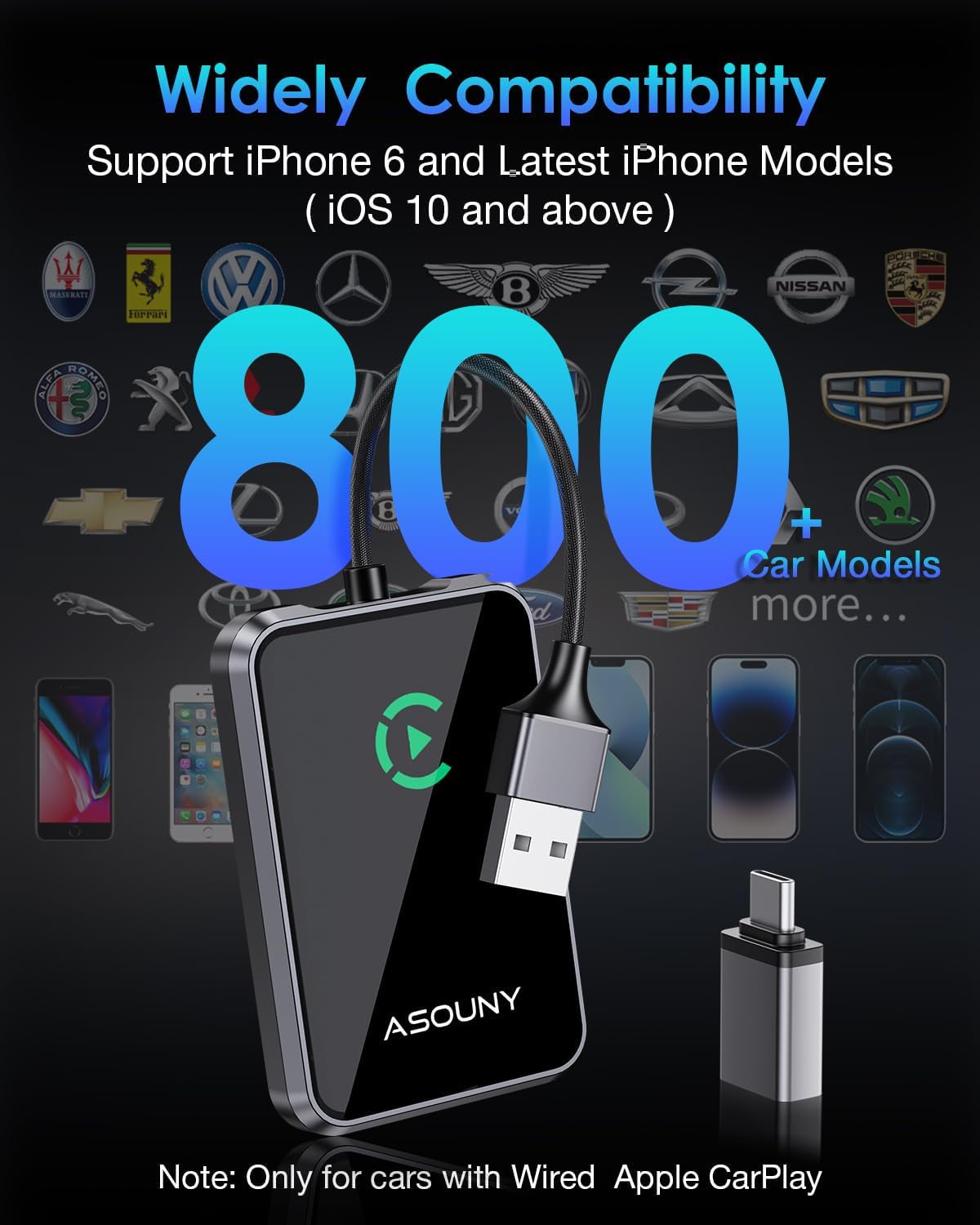 【Universal Compatibility】This Wireless CarPlay Adapter supports iPhone 6 and later iPhone models.(Not compatible with any Android phone). It is also compatible with more than 800+ car models featuring wired CarPlay. And comes with a USB to USB-C adapter for versatile connectivity.