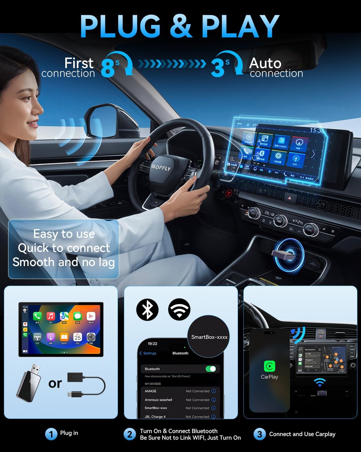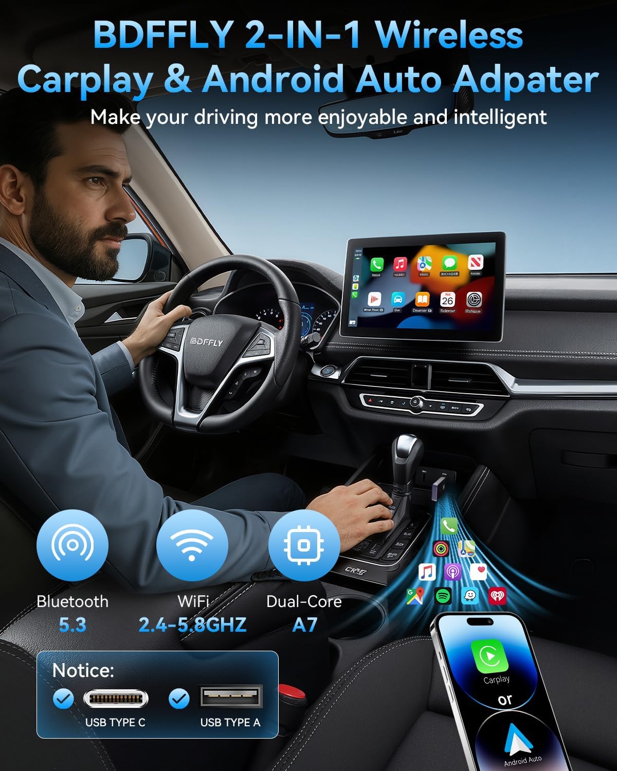 The concept of converting a wired Apple CarPlay or Android Auto system into a wireless one is incredibly appealing to anyone tired of fumbling with cables every time they get in the car. This Wireless CarPlay Adapter for iPhone & Android Auto 2-in-1 promises to do just that, offering plug-and-play simplicity and compatibility with iOS 10+ and Android 11+ devices. Here’s a review of what to expect from such a device:The Promise:Seamless Wireless ConvenienceThe primary allure of this adapter is the freedom it offers. No more plugging in your phone for every short drive, no more tangled cables, and a cleaner car interior. It effectively acts as a bridge, plugging into your car’s existing USB port (the one that enables wired CarPlay/Android Auto) and then establishing a wireless connection (initially via Bluetooth, then switching to Wi-Fi for data transfer) with your smartphone. This allows you to enjoy all the familiar features – navigation, music, calls, messages, and voice assistants – wirelessly on your car’s infotainment screen.Plug and Play Simplicity:A key selling point for these adapters is their ease of setup. Typically, you simply:1.Plug in:Connect the adapter to your car’s wired CarPlay/Android Auto USB port.2.Pair:Connect your phone to the adapter’s Bluetooth.3.Go:The adapter then establishes a Wi-Fi connection, and CarPlay or Android Auto should launch automatically on your car’s screen.Many users report that the initial setup is indeed quick and straightforward, often taking just a few minutes. Subsequent connections are usually automatic once the car starts.2-in-1 Functionality (CarPlay & Android Auto):The “2-in-1” aspect is a significant advantage, particularly for households with both iPhone and Android users, or individuals who switch between devices. Instead of needing two separate adapters, this single device supports both platforms, making it a versatile and cost-effective solution. Switching between phones usually involves disconnecting the currently connected phone’s Bluetooth/Wi-Fi and then pairing the new phone. While some advanced adapters may offer a “switch button,” most require a simple manual disconnect/reconnect process.Performance Expectations:Connection Speed & Stability:Modern adapters, especially those utilizing 5GHz Wi-Fi for data transfer (which many do), aim for fast boot-up times and minimal lag. Once connected, the experience should be largely seamless, with smooth navigation, responsive touch controls, and clear audio for calls and music. However, occasional disconnections or slight latency can occur, though these issues are becoming less common with newer chipsets and firmware updates.Compatibility:The stated compatibility with iOS 10+ and Android 11+ is broad, covering a vast majority of active smartphones. It’s crucial that your car already supports wired CarPlay or Android Auto; these adapters convert a wired connection to wireless, they don’t add CarPlay/Android Auto to a car that doesn’t have it.Advantages:Cable-Free Convenience:The biggest draw – eliminates the need to plug in your phone every time.Cleaner Interior:Reduces cable clutter in your car.Preserves Phone Port:Less wear and tear on your phone’s charging port.2-in-1 Versatility:Supports both Apple CarPlay and Android Auto in one device.Plug & Play Setup:Generally very easy to install and use.Automatic Reconnection:Connects automatically after the initial pairing.Maintains OEM Functionality:All original CarPlay/Android Auto features like navigation, music, Siri/Google Assistant, and calls work wirelessly.Potential Considerations:Initial Boot-Up Time:There will be a short delay (typically 10-30 seconds) from when you start your car until the wireless connection is fully established and CarPlay/Android Auto appears on screen.Occasional Glitches:While rare with good adapters, minor connection drops or lag can sometimes occur. Firmware updates (if available from the manufacturer) can often resolve these.Battery Drain on Phone:While not physically plugged in, your phone will still be using Wi-Fi and Bluetooth, which consumes battery. It’s still advisable to have a charging solution in your car for longer trips.Not for Cars Without Wired CarPlay/Android Auto:This adapter requires your car to already have wired CarPlay or Android Auto. It does not add these features to unsupported vehicles.Overall Verdict:A Wireless CarPlay Adapter for iPhone & Android Auto 2-in1 is a fantastic upgrade for anyone with a compatible car and smartphone. It delivers on the promise of effortless wireless connectivity, significantly enhancing the in-car experience by eliminating messy cables and adding convenience. While there might be minor quirks common to all wireless adapters (like a short boot-up time), the overall benefit of plug-and-play wireless integration for both major smartphone platforms makes this type of device a highly recommended accessory for the modern driver. It’s an investment in convenience that quickly pays off in daily use.