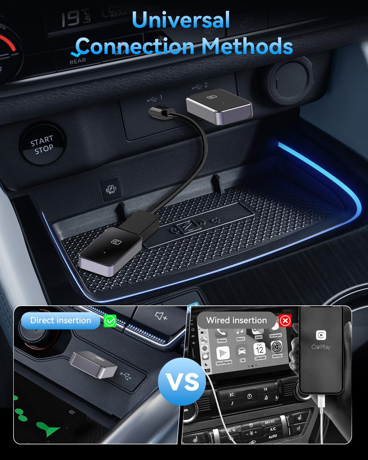 【Wireless CarPlay Adapter for Apple】No cables required! Convert your factory wired for Apple CarPlay to wireless and instantly upgrade your driving experience! Say goodbye to cluttered cables and enjoy navigation, music streaming, hands-free calling, messaging and voice assistants while retaining your original vehicle controls. Wireless carplay adapter for iphone ,Keep your car tidy and enjoy a safer, smarter driving experience.