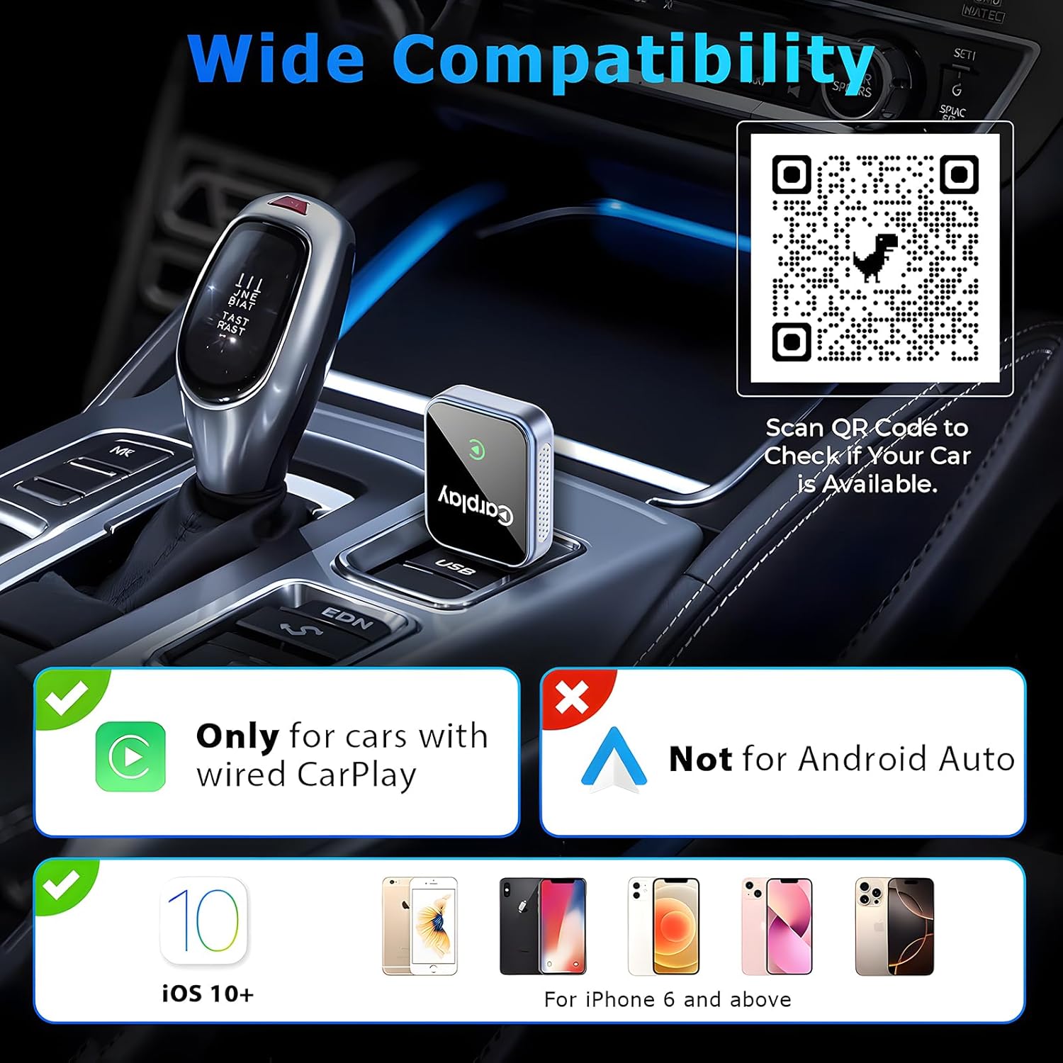 【Compatibility & Requirements】Requires factory wired Apple CarPlay (converts wired → wireless). Does NOT add CarPlay. iPhone only (iOS 10+) — NOT for Android phones / Android Auto. Quick check: plug iPhone into the car’s CarPlay USB port; if CarPlay appears, it’s compatible.