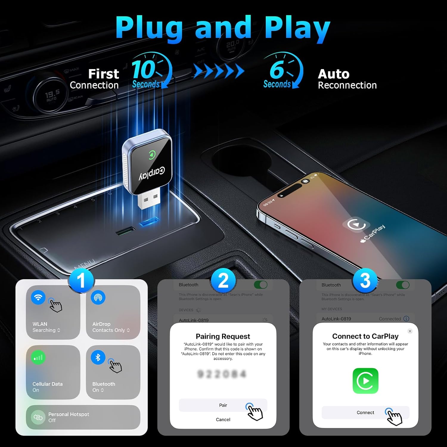 【Plug & Play, Auto-Reconnect】Set up in just three simple steps to turn wired CarPlay into wireless. Once paired, this USB wireless CarPlay adapter reconnects automatically every time you start your car, no repeated setup needed. No more tangled cables, just smooth wireless CarPlay for a cleaner dashboard and a hassle-free daily drive.
